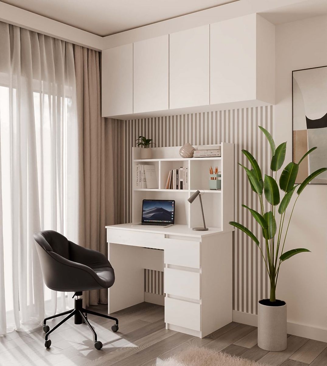 Die moderne Form, das matte Weiß und das praktische Aufbewahrungssystem machen das Möbelstück ideal für Jugendzimmer, Kinderzimmer und das Homeoffice.