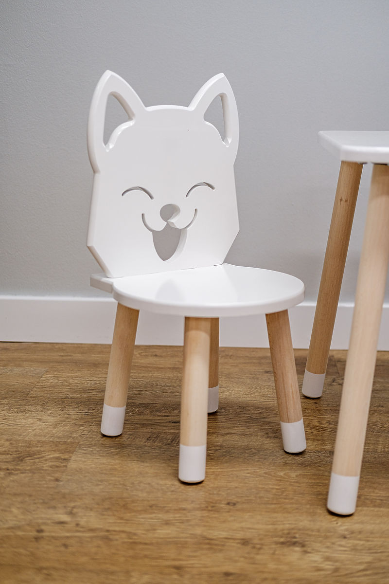 Ein schönes Holzset aus einem Tisch und zwei Stühlen in Form eines Fuchses, das Ihre Kinder sicher lieben werden. Dieses originelle Set schafft eine gemütliche Ecke zum Malen, Lesen oder Naschen.
