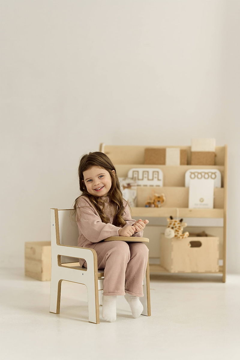 Der hölzerne Kinderstuhl ist für Kinder unterschiedlichen Alters geeignet – sowohl für ein einjähriges Kind, das die Welt entdeckt, als auch für einen älteren, kreativen Vorschüler. Er bietet eine feste Rückenstütze und gleichzeitig bequemes Sitzen beim Spielen, Zeichnen oder Essen. Er eignet sich auch hervorragend in der Küche oder im Badezimmer – das Kind kann auf den Sitz steigen und leicht die Arbeitsplatte oder das Waschbecken erreichen. Alle Kanten sind sorgfältig abgerundet, um maximale Sicherheit für die kleinen Benutzer zu gewährleisten.