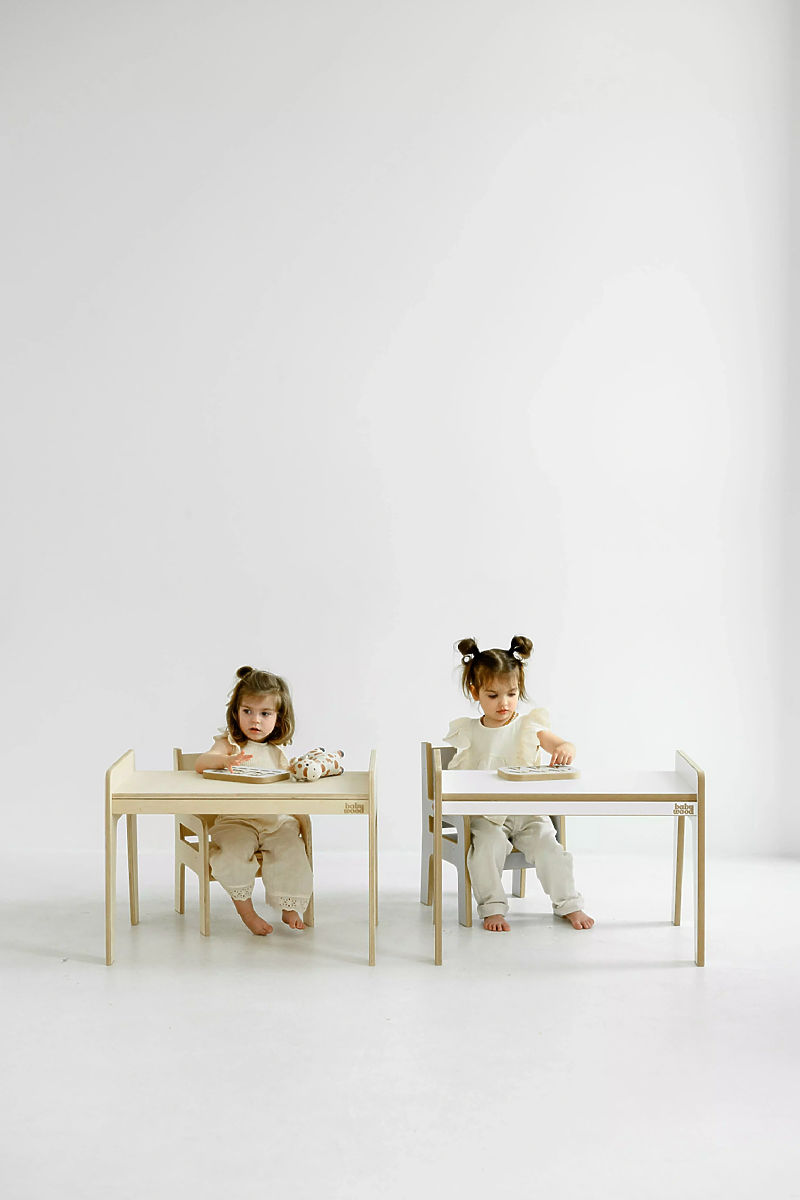 Das Set aus Tisch und Stuhl ist die ideale Lösung für kleine Entdecker und kreative Seelen. Es wurde mit Fokus auf Komfort, Sicherheit und Bewegungsfreiheit beim Spielen, Zeichnen und Lernen entworfen. Die minimalistische Form, zeitloses Design und natürliche Materialien machen das Set zu einem schönen und funktionalen Element im Kinderzimmer. Abgerundete Kanten und eine stabile Konstruktion bieten maximale Sicherheit, während die richtige Möbelhöhe die Selbstständigkeit des Kindes und gesundes Sitzen unterstützt.