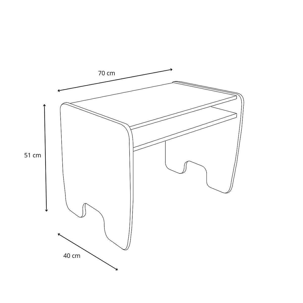 Der Tisch ist mit einem geräumigen Regal unter der Platte ausgestattet, das die Organisation und Aufbewahrung der wichtigsten Gegenstände wie Bücher, Buntstifte oder Spielzeug erleichtert. So ist alles immer griffbereit und es ist einfacher, Ordnung im Zimmer zu halten.