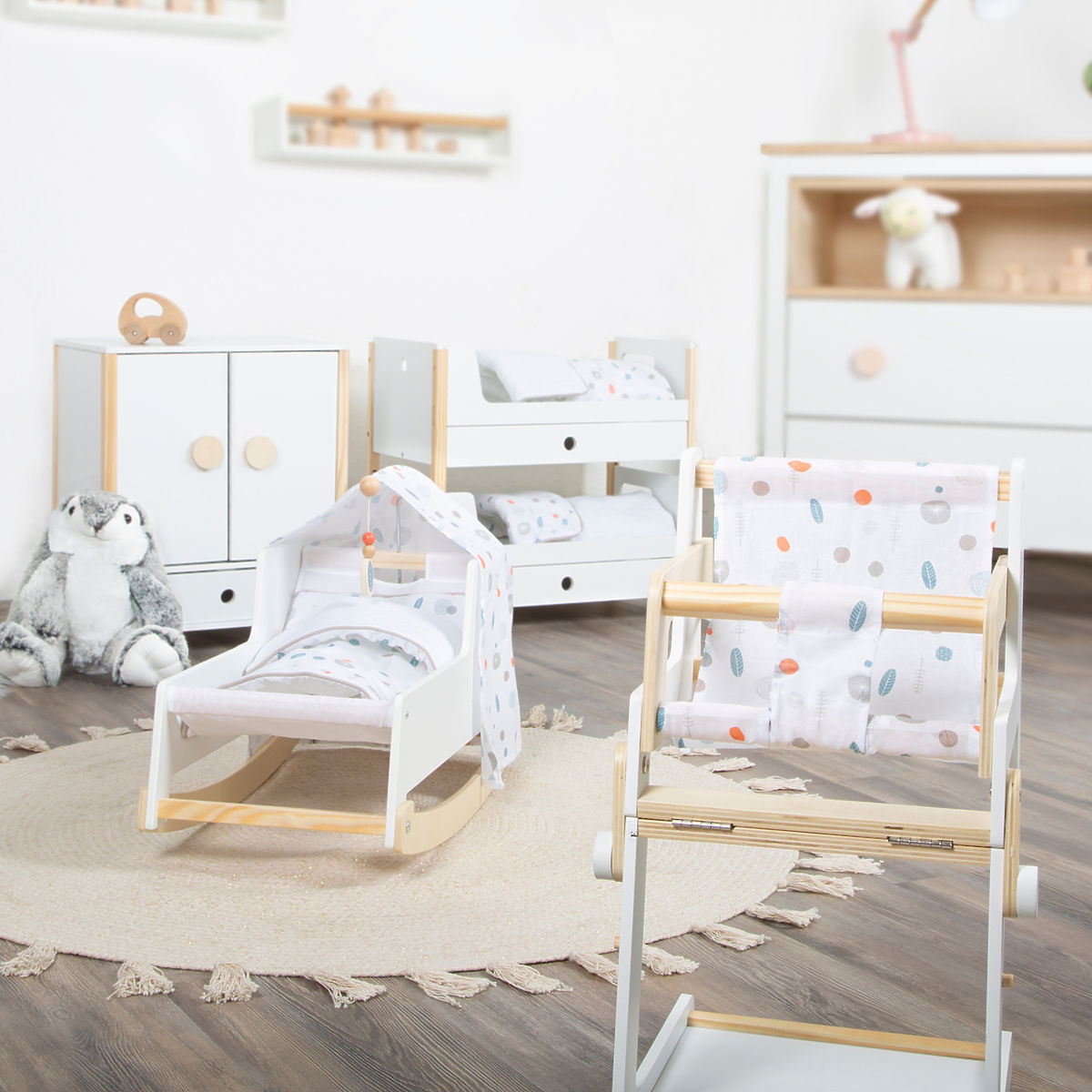 Alle Puppenkleider griffbereit. Der geräumige Holzschrank beeindruckt nicht nur durch seine einfach zu öffnenden Türen. Einfaches skandinavisches Design, innen sanfte Farbtöne. Beim Öffnen des Schranks finden Sie an der Kleiderstange Bügel, außerdem abnehmbare Regale und eine Schublade. So können Sie alle Kleider nach eigenem Geschmack verstauen und auch eigene Bügel verwenden. Dank dieses Spielzeugs lernen Kinder die Wichtigkeit der Ordnung und wie man gut auf seine Kleidung achtet, damit sie möglichst lange hält. Hauptmerkmale Geräumiger HolzschrankEinfach zu öffnende TürenKleiderstange, Bügel, SchubladeAbgerundete Kanten, sichtbares HolzGeschlechtsneutrale FarbeSkandinavisches lineares Design Little Button Die Reihe attraktiven Zubehörs für Puppen Little Button bietet eine breite Palette von Produkten, vom Kinderwagen über den Hochstuhl bis hin zum Schrank. Kunden werden leicht durch das einheitliche funktionale und dezente Design mit klaren Linien und zurückhaltenden neutralen Farben angesprochen. Dadurch können sie zusammen harmonische Sets bilden, die moderne Innenräume geschmackvoll ergänzen. Die durchdachte Konstruktion und hochwertige Verarbeitung sorgen für hohe Stabilität, Sicherheit und Langlebigkeit. Richten Sie mit ihrer Hilfe eine stilvolle Puppenecke ein, in der Ihre Kinder ihre Fantasie und Pflegefähigkeiten entwickeln können.
