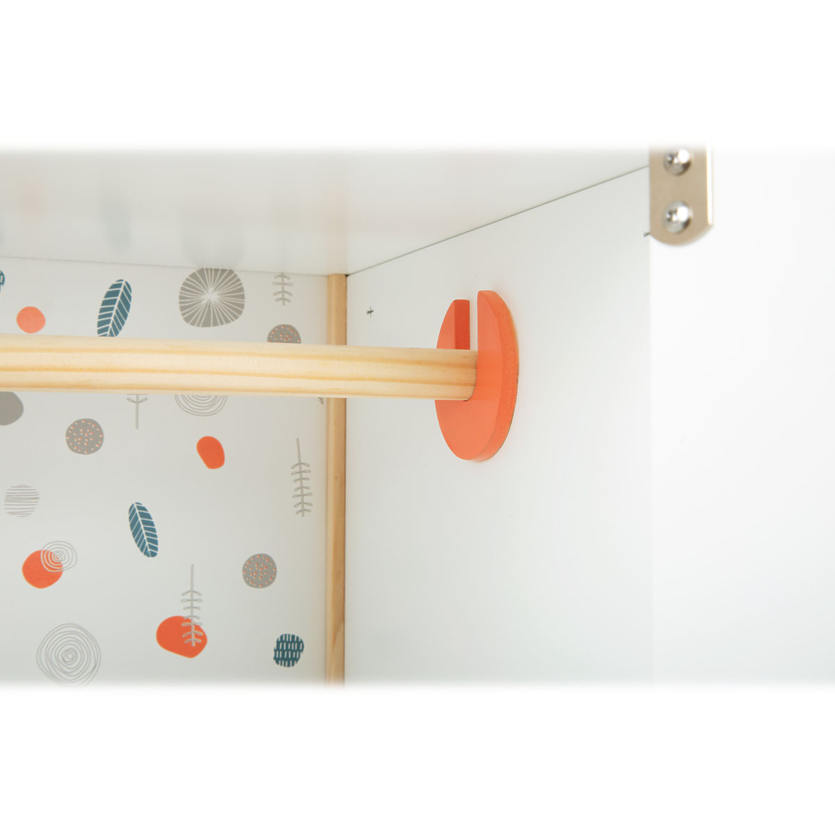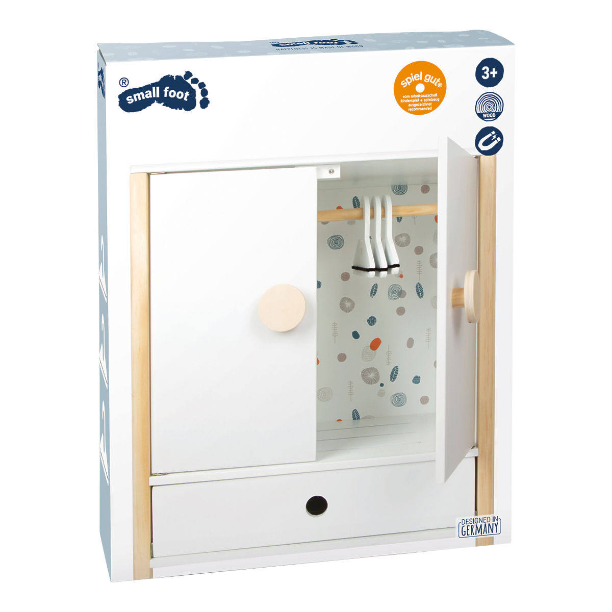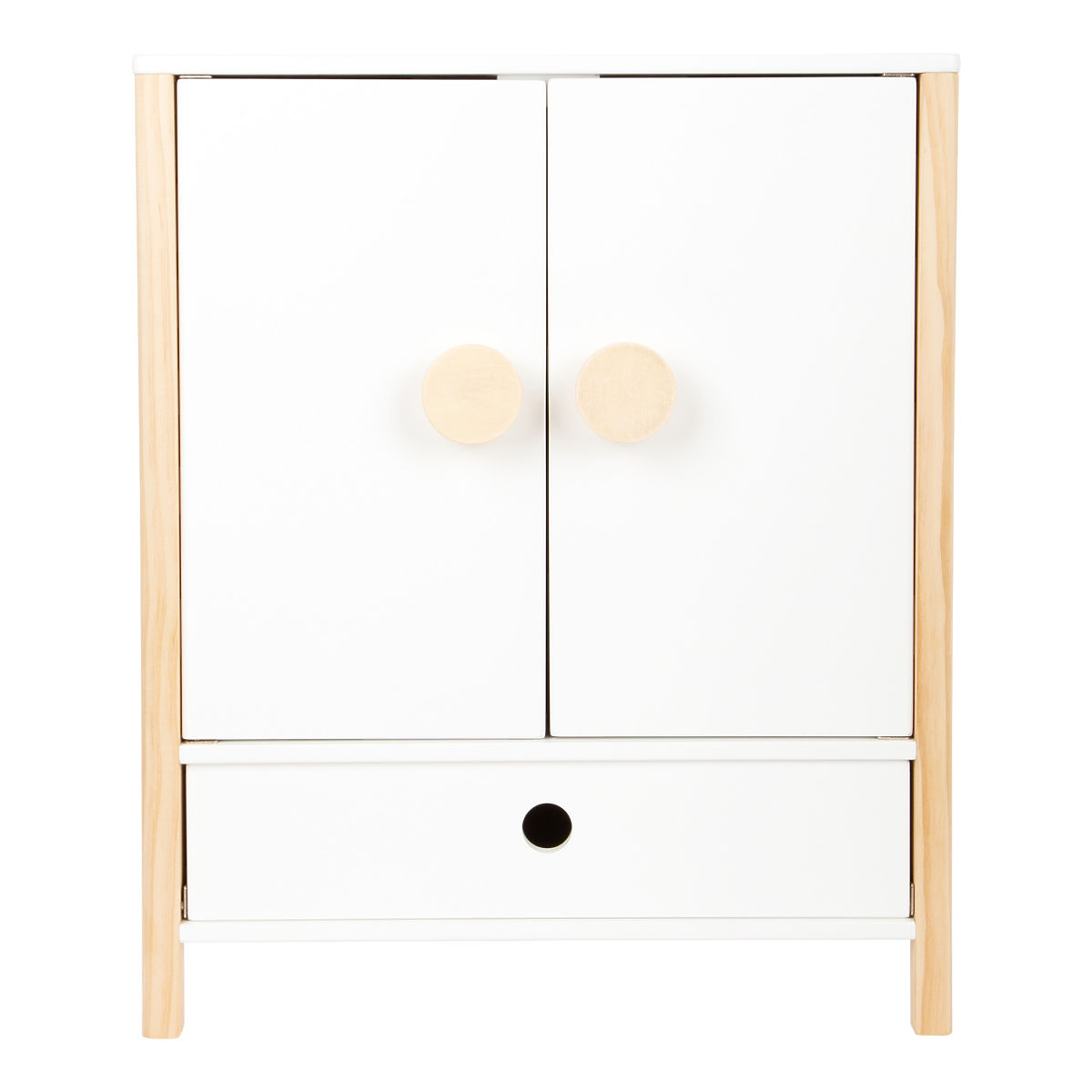 Alle Puppenkleider griffbereit. Der geräumige Holzschrank beeindruckt nicht nur durch seine einfach zu öffnenden Türen. Einfaches skandinavisches Design, innen .. mehr