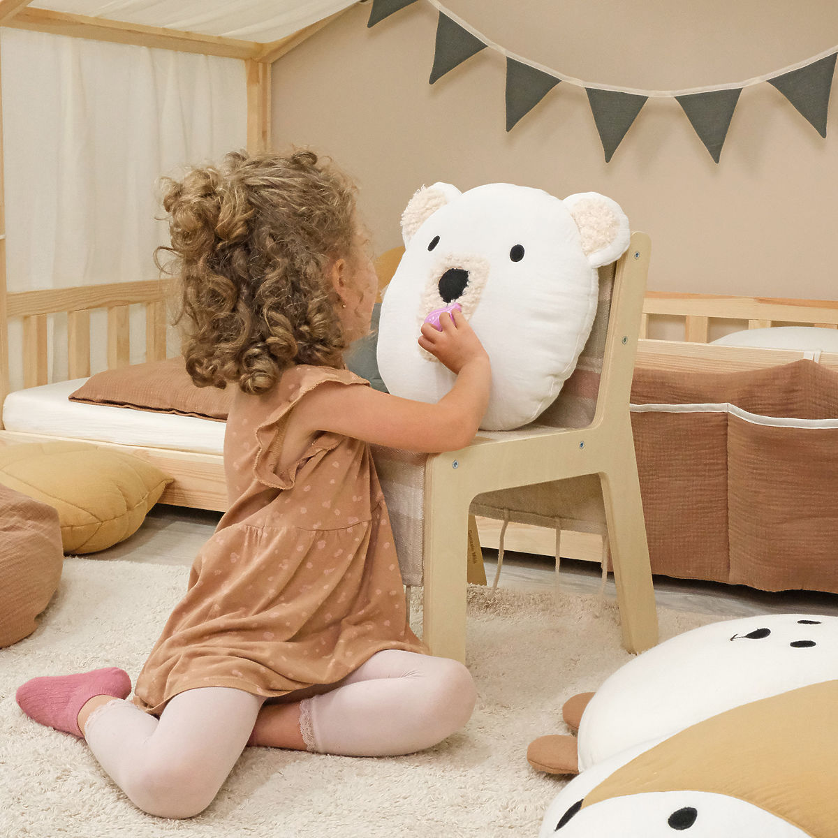 Lassen Sie sich von der Weichheit des Musselins verwöhnen und gönnen Sie Ihrem Kind ein stilvolles Kissen mit Bärenmotiv in ecru, das dem Kinderzimmer einen natürlichen Charme verleiht. Dieses einzigartige Stück in Beige ist aus angenehmem und atmungsaktivem Musselin mit antiallergischer Füllung gefertigt, und die Nase sowie die Mitte der Ohren des Bären bestehen aus weichem Kunstlammfell. Dank des hochwertigen Materials ist das Kissen ideal für die empfindliche Haut des Babys.