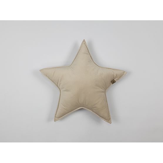 Hellbeiges doppelseitiges Zierkissen in Form eines Sterns aus angenehmem Samt. Es passt in jedes Kinderzimmer. Gefüllt mit einer Silikonkugel.