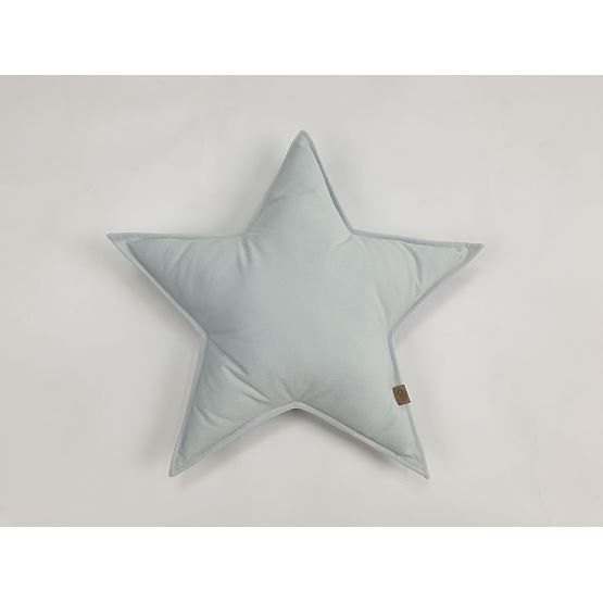 Hellgraues doppelseitiges Zierkissen in Form eines Sterns aus angenehmem Samt. Es passt in jedes Kinderzimmer. Gefüllt mit einer Silikonkugel.