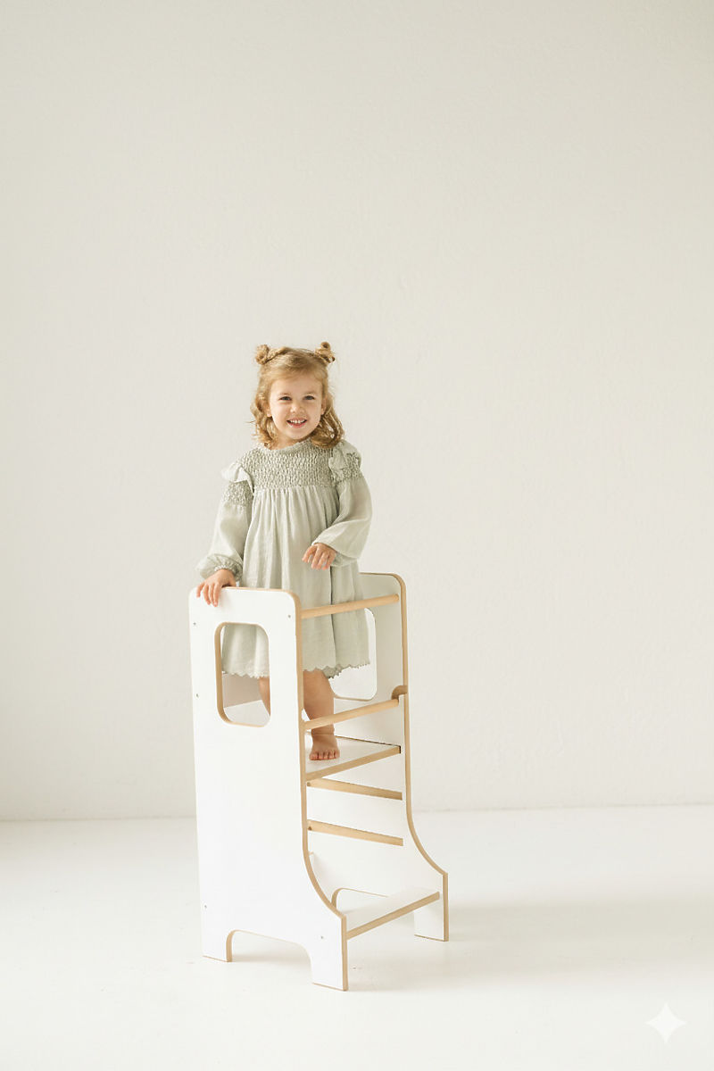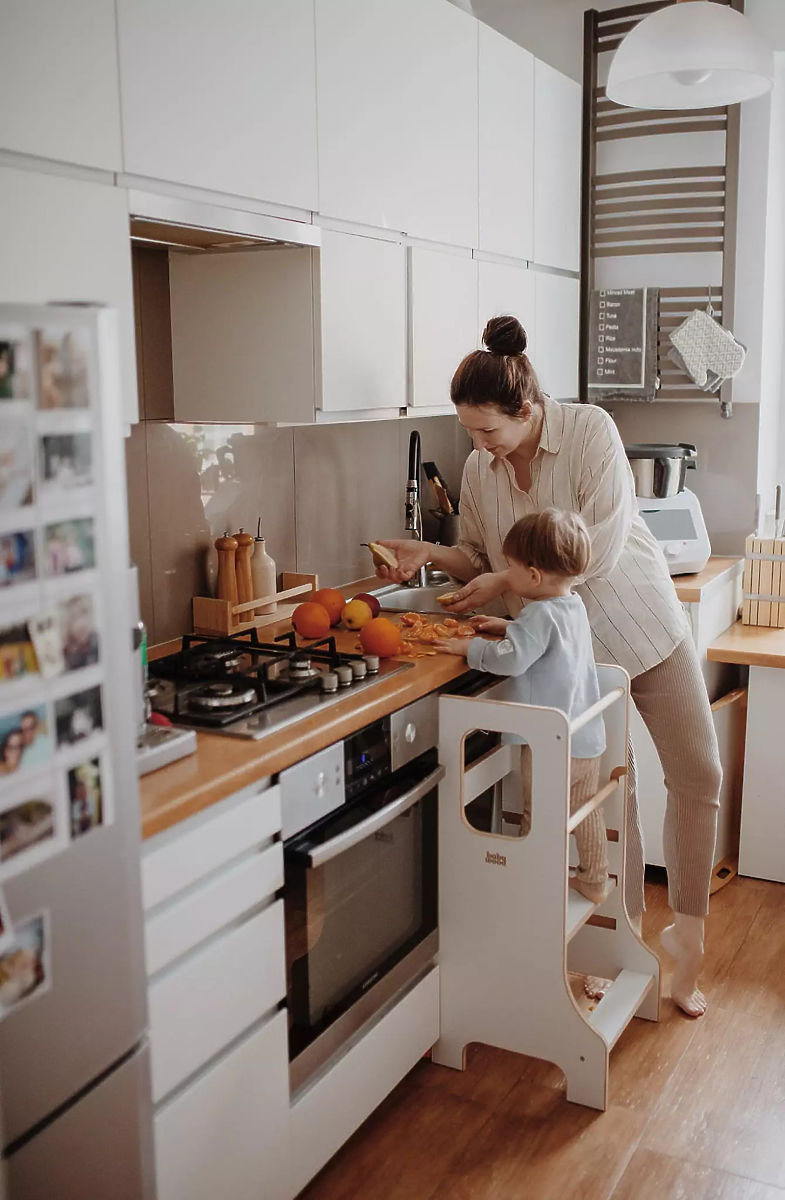 Lernturm SLIM in Weiß ist die ideale Wahl für Eltern, die ihre Kinder sicher in alltägliche Hausarbeiten einbeziehen und ihnen ermöglichen möchten, die Welt aktiv zu entdecken. Dank seiner durchdachten Konstruktion fördert er Selbstständigkeit, Kreativität und die Entwicklung motorischer Fähigkeiten und hilft Kindern, auf natürliche Weise neue Erfahrungen zu sammeln. Gemeinsame Momente beim Kochen oder anderen Aktivitäten werden so zu unterhaltsamen und wertvollen Erlebnissen. Die schlanke Ausführung der SLIM-Version wirkt elegant und nimmt nicht unnötig viel Platz ein, bleibt jedoch stabil und sicher. Kinder können selbstständig in den Turm klettern und sicher wieder heruntersteigen, was ihr Selbstbewusstsein und ihre Unabhängigkeit stärkt.