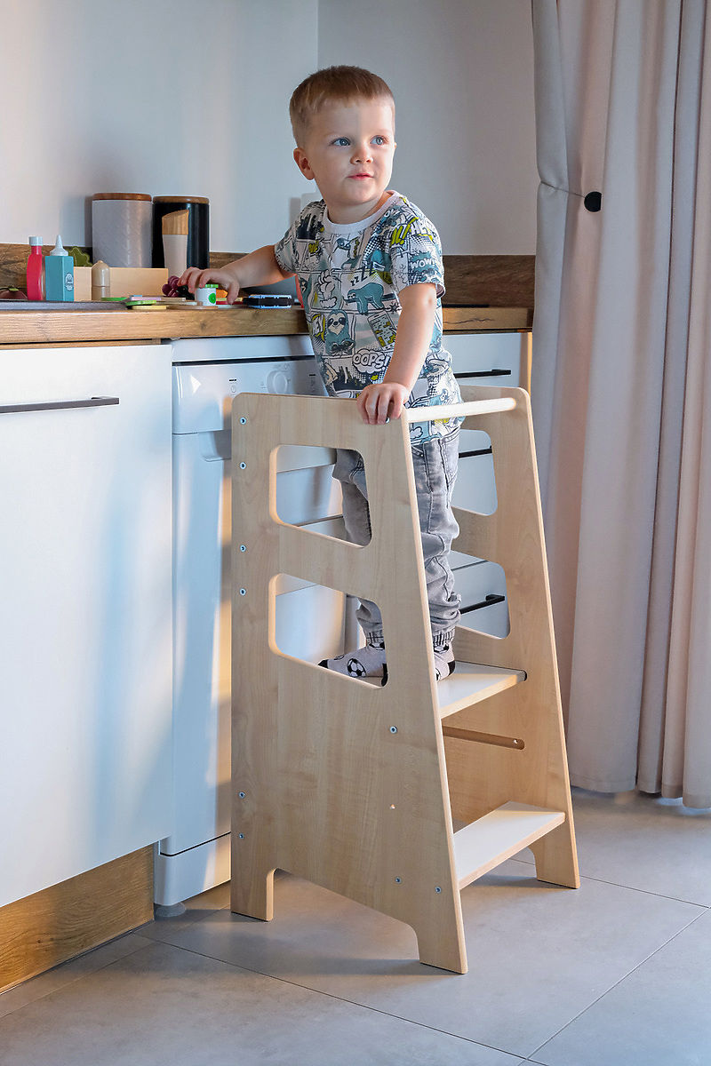 Kinder-Montessori-Lernturm im braunen Design mit trapezförmigen Ausschnitten mit weißen Stufen. Es ist ein zuverlässiger und praktischer Helfer, der Kreativität .. mehr