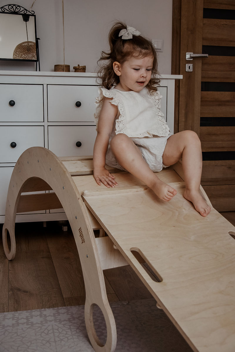 Holz-Montessori-Schaukel mit Rutsche und Kletterwand in Naturfarbe ist das perfekte multifunktionale Zubehör für jedes Kinderzimmer. Diese Schaukel bietet Kindern nicht nur ein lustiges Schaukelerlebnis, sondern auch die Möglichkeit zum Klettern und Rutschen, was ihre motorischen Fähigkeiten, ihr Gleichgewicht und ihre Kraft fördert.