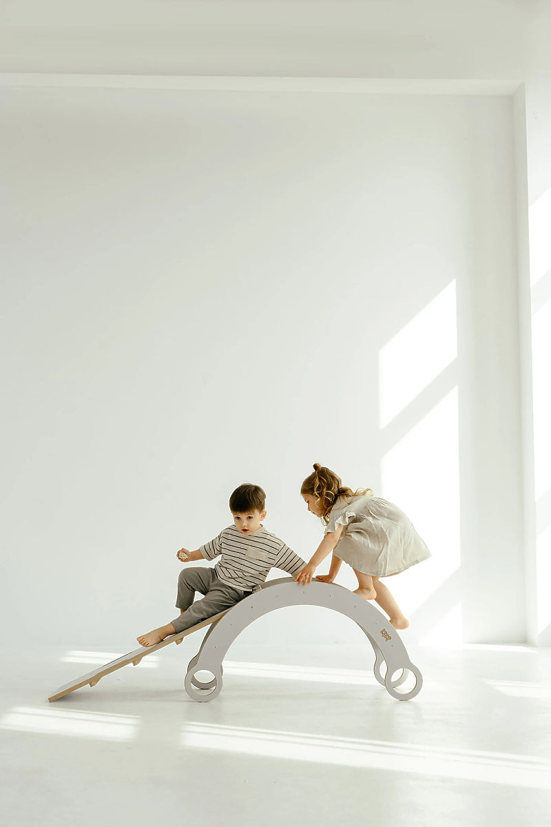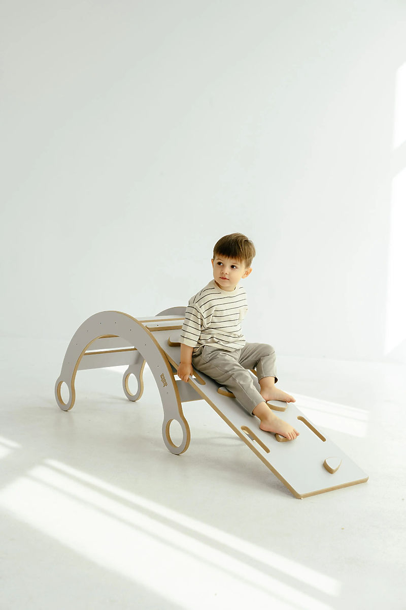 Der stilvolle Holz-Montessori-Schaukel mit Rutsche und Kletterwand in Weiß passt perfekt in jedes Kinderzimmer. Diese Schaukel bietet nicht nur ein lustiges Schaukelerlebnis, sondern auch die Möglichkeit zum Klettern und Rutschen, was die motorischen Fähigkeiten, das Gleichgewicht und die Kraft der Kinder fördert.
