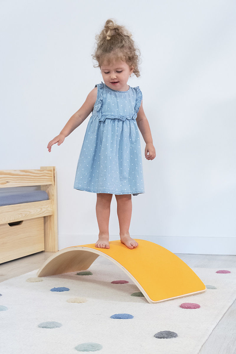 Das Balancebrett aus Holz dient sowohl als Spielzeug als auch als physiotherapeutische Gleichgewichtshilfe, mit der Kinder spielerisch ihre Bewegungsfertigkeiten und Fähigkeiten wie Koordination, Gleichgewicht, Konzentration, Kraft sowie Grob- und Feinmotorik entwickeln.