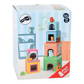 Würfel bestehen aus Pappe, Tiere aus Holz. Versuchen Sie, Würfel unterschiedlicher Größe in der richtigen Reihenfolge vom größten zum kleinsten zu stapeln und einen Turm zu bilden. Alle Faltklötze verfügen über eine Öffnung, in der sechs verschiedene Holztiere ihr Zuhause finden. Jedes Haustier muss seinen richtigen Schlafplatz haben. Hauptmerkmale: Entwickelt die Hand-Auge-Koordination. Schöne Illustration. Entwickelt Feinmotorik und Geschicklichkeit. Entspricht der europäischen Sicherheitsnorm