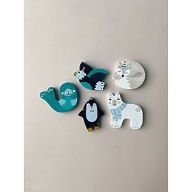 Schönes sensorisches Steckpuzzle für Kinder, komplett aus Holz. Wenn Kinder ein Teil aus dem Rahmen nehmen, entdecken sie darunter ein bestimmtes Material, das unter jedem Tierteil eine andere Textur hat. Illustriert von Michelle Carlslund.