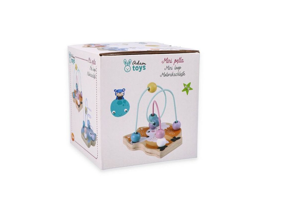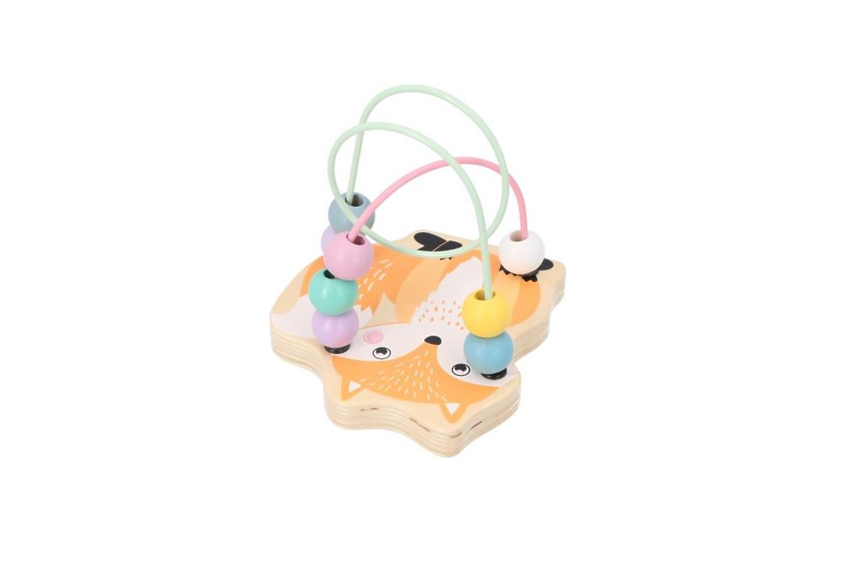 Das Spielzeug besteht aus einem Sockel mit der Abbildung des Fuchses, 2 Metallstäben, die so gebogen sind, dass sie Schleifen bilden, und an jedem Stab befinden sich 4 Holzperlen. Alles ist in einer ästhetischen Schachtel verpackt, ideal als Geschenk.