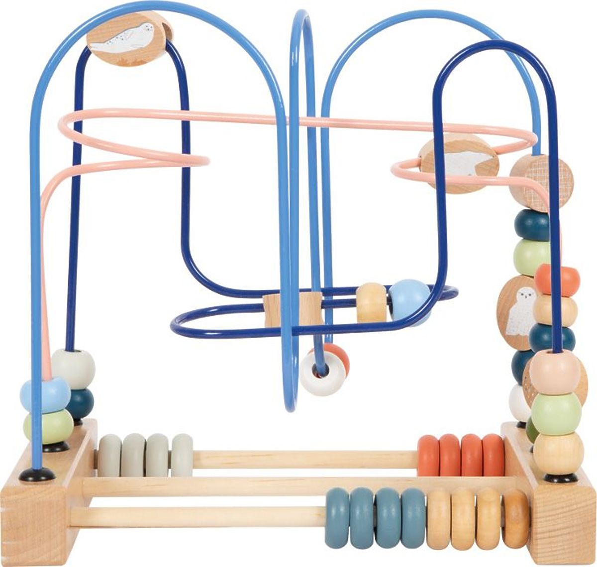 An drei farbigen Metallstäben (dunkelblau, rosa und blau) befinden sich Holzperlen, die das Kind nach Belieben verschieben kann, wodurch es die Genauigkeit der Finger- und Handbewegungen trainiert. Zusätzlich befinden sich an den Schleifen 3 Würfel mit Bildern von arktischen Tieren: Schneeeule, Eisbär und Seehund. An der Basis der Schleife sind 2 Schienen mit bunten Schiebekugeln zum Zählenlernen.