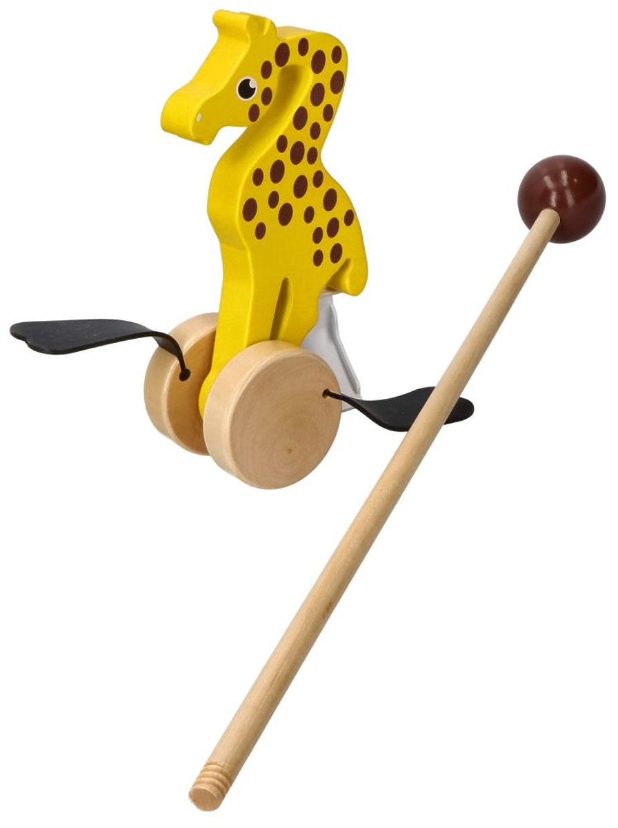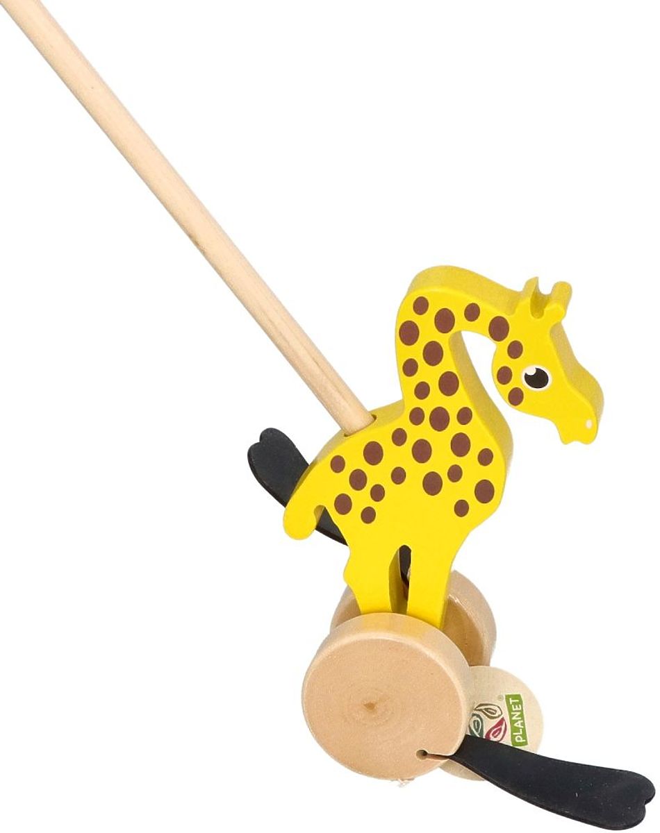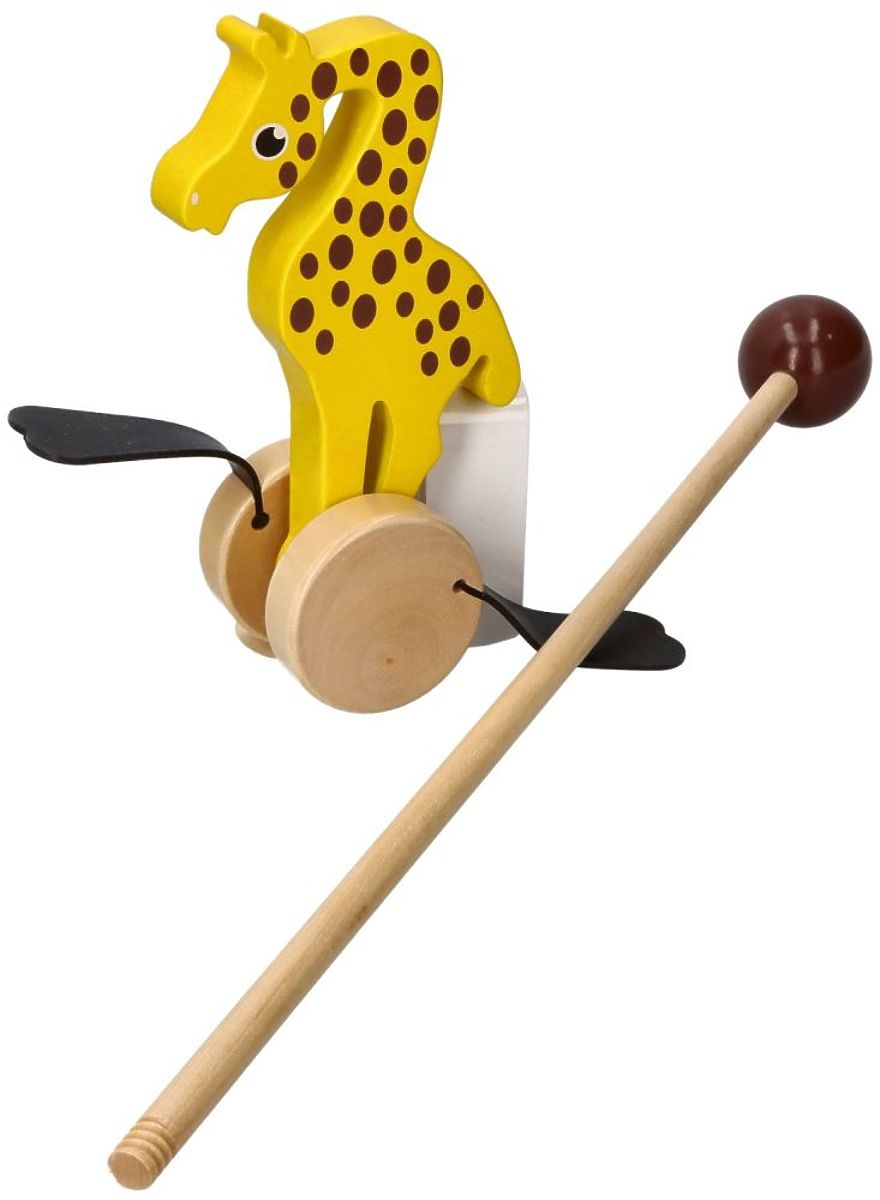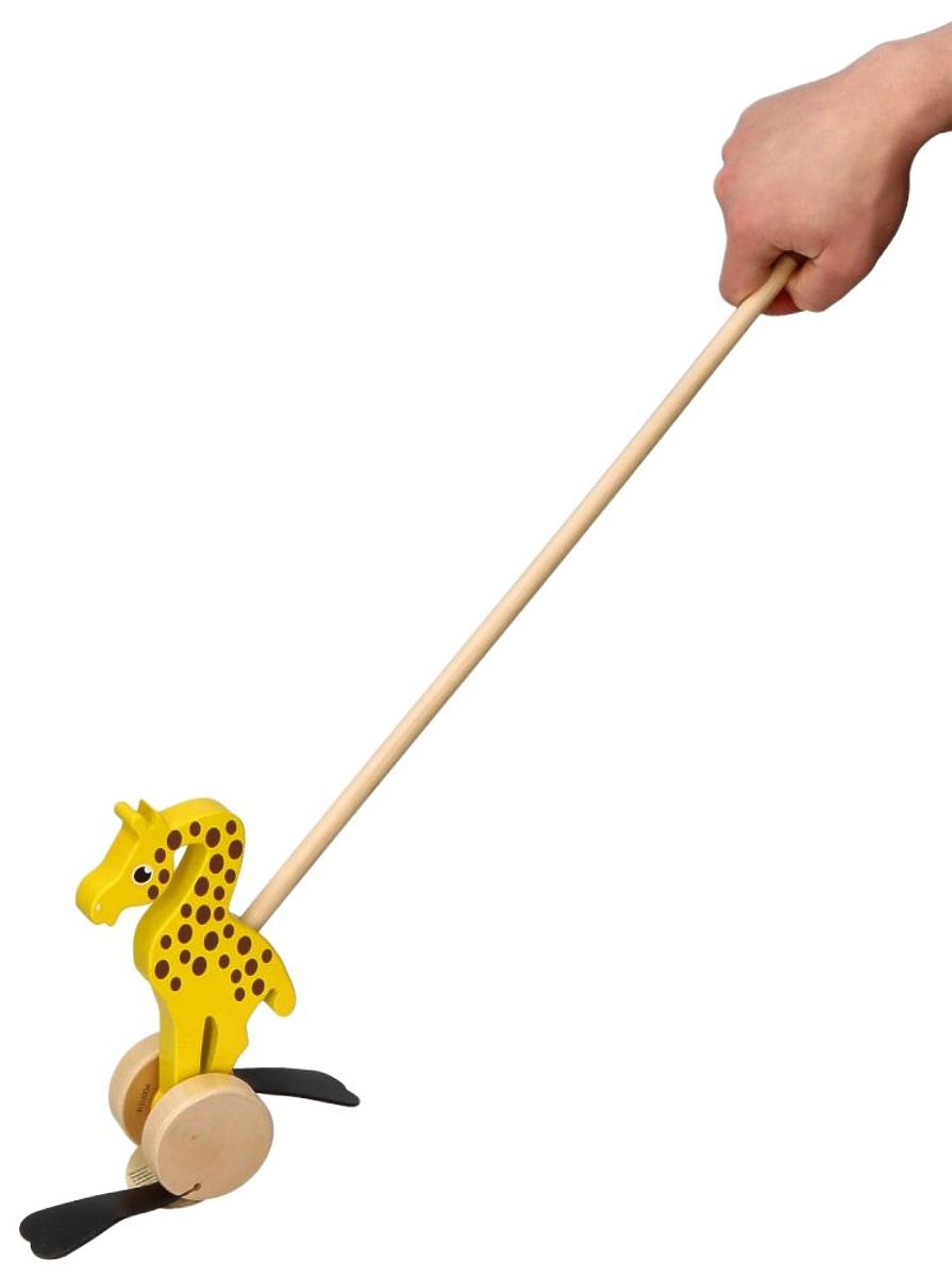 Wir präsentieren den idealen Begleiter für gemeinsame Spaziergänge. Die niedliche Giraffe aus Holz ist ein Spielzeug, das das Kind zum Bewegen und Gehen motiviert. Das Kind greift den Stab und schiebt das Tier vor sich her. Die Räder verursachen beim Drehen ein Klatschen der Gummielemente auf dem Boden. Der Stab endet mit einem Griff für bequemes Schieben des Spielzeugs. Der Stab ist schraubbar.