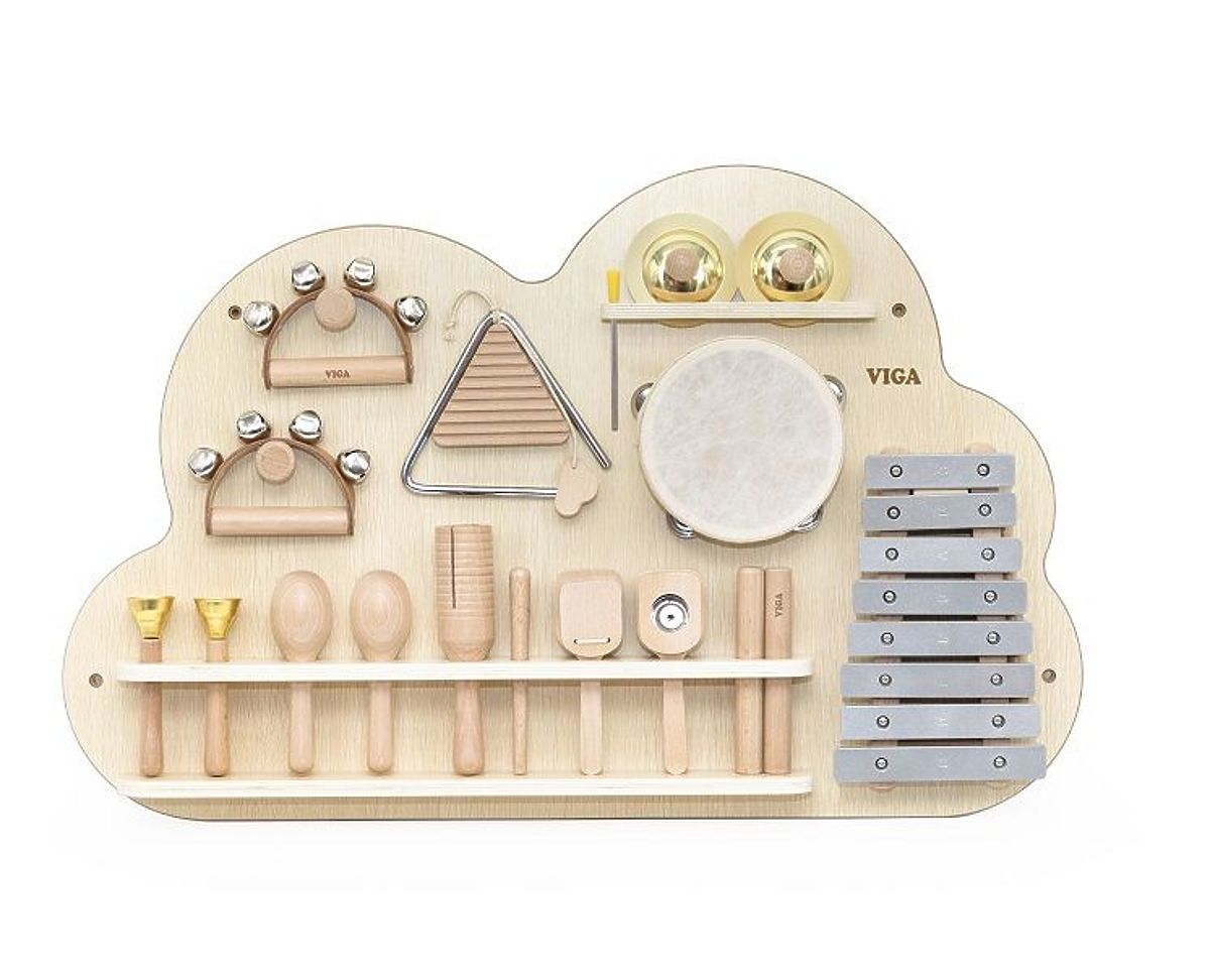 Die Kinder werden schnell vom Inhalt begeistert sein, und das Motiv des Paneels ermöglicht es, Ordnung zu halten. Auf dem Paneel befinden sich 4 Halterungen zum Aufhängen von Werkzeugen, ein oberes Regal, auf dem 2 Teller mit Schlägel abgelegt werden können, und ein unteres Regal mit Aussparungen, auf dem Werkzeuge vertikal abgelegt werden können. Auf der rechten Seite gibt es Platz für die Ablage eines Xylophons.