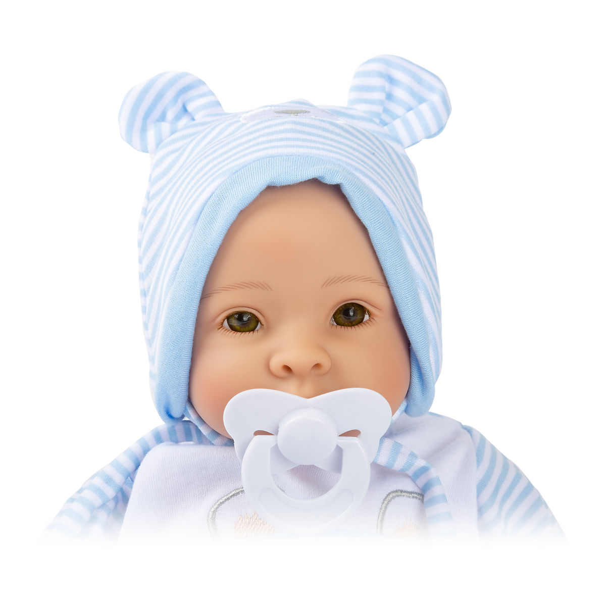 Puppe Lukas mit weichem Stoffkörper und Kunststoffkopf und -gliedmaßen mit vielen Accessoires. Die Kleidung für die Puppe lässt sich leicht an- und ausziehen. Im Lieferumfang sind auch ein farblich abgestimmter Schnuller und eine Decke enthalten. Besonders realistischer Gesichtsausdruck mit schönen, nicht blinkenden Augen. Puppen mit weichem Körper sind ideal für jüngere Kinder, deren motorische Fähigkeiten noch nicht so weit entwickelt sind. Das Spielen mit Puppen fördert die Entwicklung von Fantasie und sozialen Fähigkeiten. Der perfekte Spiel- und Kuschelbegleiter dank des weichen Körpers. Hauptmerkmale: weicher Stoffkörper, fördert Fantasie und soziale Fähigkeiten, Puppenkleidung im Lieferumfang enthalten