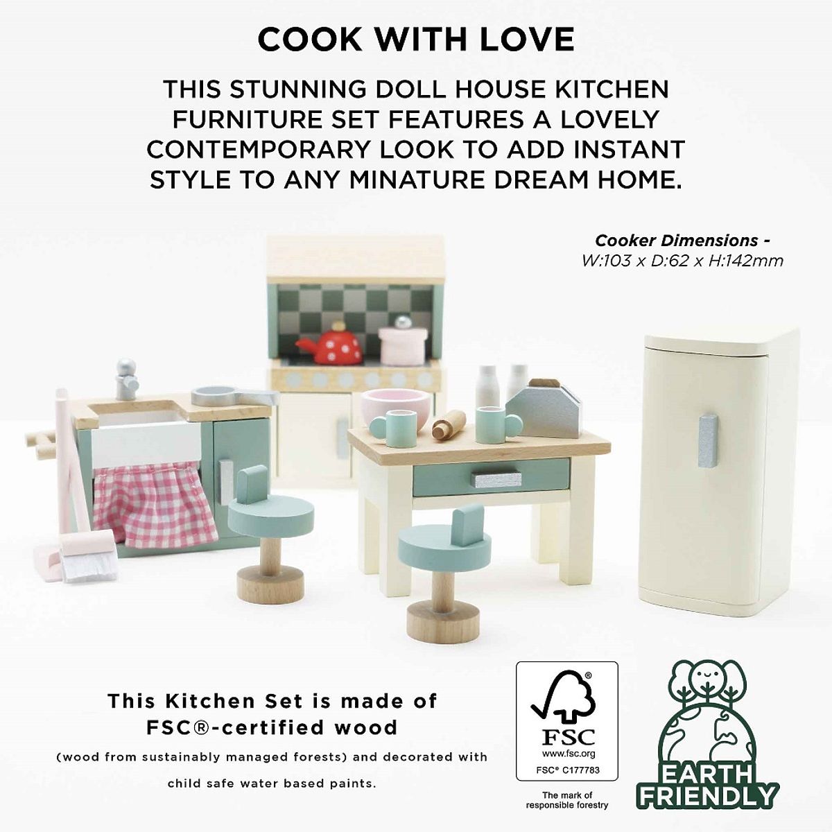 Kein Puppenhaus ist komplett ohne eine ausgestattete Küche. Mit diesem schönen Küchenset aus Holz können Kinder für ihre kleinen Gäste etwas Gutes kochen oder backen. Dieses fantasievolle Set mit Liebe zum Detail besteht aus einer Spüle, einem Herd, einem Backofen mit aufklappbarer Tür, einem großen Kühlschrank mit aufklappbarer Tür, einem Tisch mit 2 Stühlen, an dem Sie schneiden und zubereiten können. Die Größe passt zu Le Toy Van-Puppenhäusern. Weitere Daisylane-Puppenhauszubehörteile finden Sie auf unserer Website. Spielzeug mit einem Zweck Alle Spielzeuge von Le Toy Van werden mit einem Zweck hergestellt – um eine lange Lebensdauer zu gewährleisten. Mit Liebe von erfahrenen Kunsthandwerkern unter Verwendung ethischer Praktiken und nachhaltiger Materialien entworfen, die unseren Planeten schonen. Hauptmerkmale: Maßstab 1:12, ethisch einwandfrei hergestellt aus nachhaltigen Materialien, getestet nach strengsten Standards, bemalt mit ungiftigen Farben auf Wasserbasis, schult Kommunikationsfähigkeiten und Koordination, inspiriert zu kreativem und fantasievollem Spielen. Daisylane-Kollektion: Prestigeträchtige Sammlung von Puppenhäusern und Zubehör von Le Toy Van . Vor mehr als 25 Jahren entwarf Gründer Georges sein erstes Puppenhaus, den Grundstein dieses Unternehmens. Die hölzernen Puppenhäuser von Daisylane werden unter ethischen Gesichtspunkten aus nachhaltigen Materialien hergestellt und sind einzigartig und werden die Fantasie eines Kindes nicht bremsen. Ein Familienerbstück, eine echte Gaming-Investition.