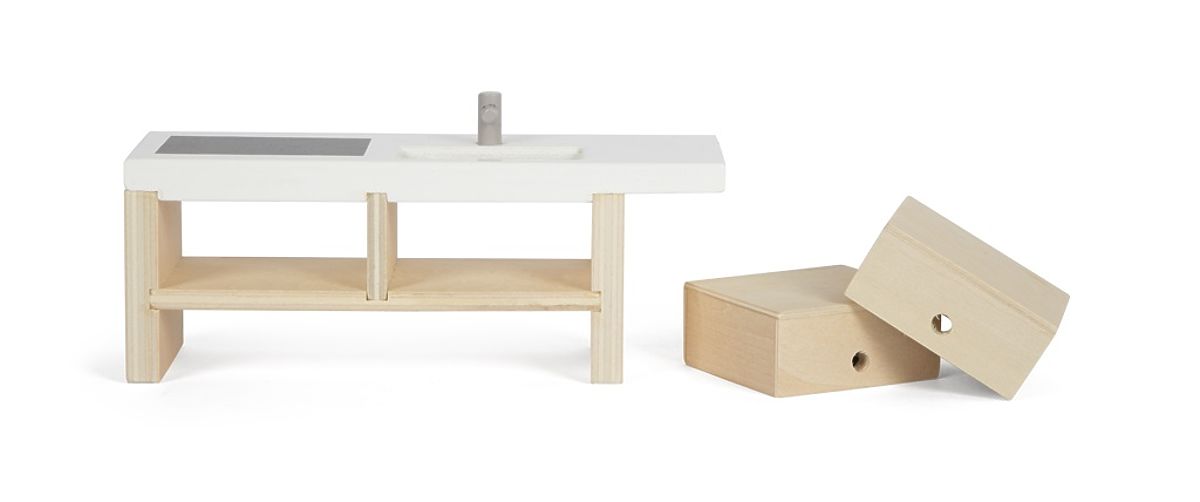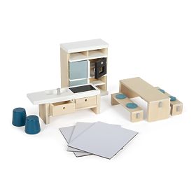 Richten Sie das Puppenhaus mit einer gemütlichen und stilvollen Küche ein, die das Herzstück jedes Mini-Heims wird! Diese detailreich gestaltete Küche besteht aus einem hohen Küchenschrank, einer freistehenden Kücheninsel, 2 Hockern und einem Tisch mit 2 Bänken mit abnehmbaren Sitzkissen. Sie ist aus hochwertigen und unbedenklichen Materialien gefertigt, die für Kinder geeignet sind.