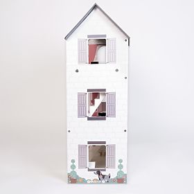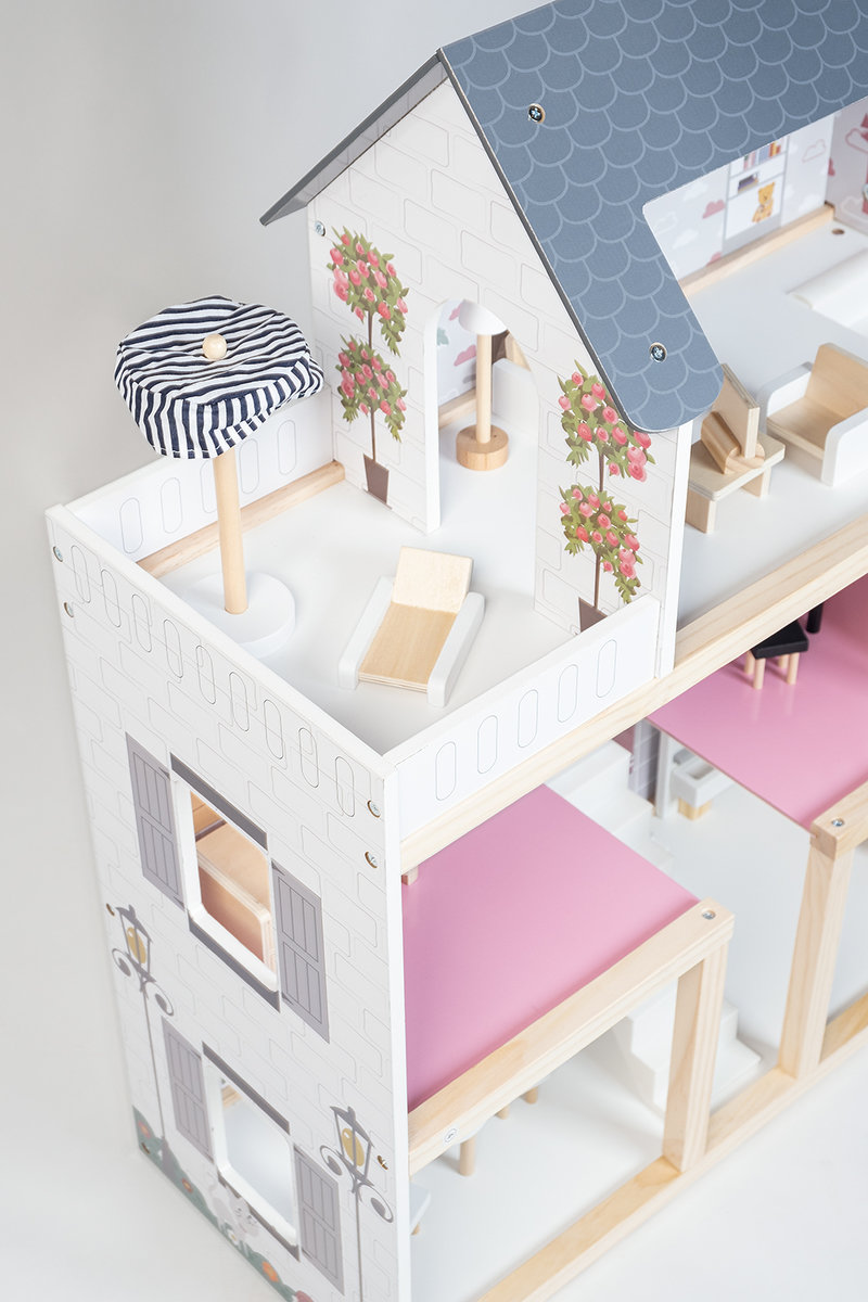 Das Haus ist aus Holz in sanften Naturtönen gefertigt. Alle Kanten sind abgerundet, was die Sicherheit beim Spielen gewährleistet .