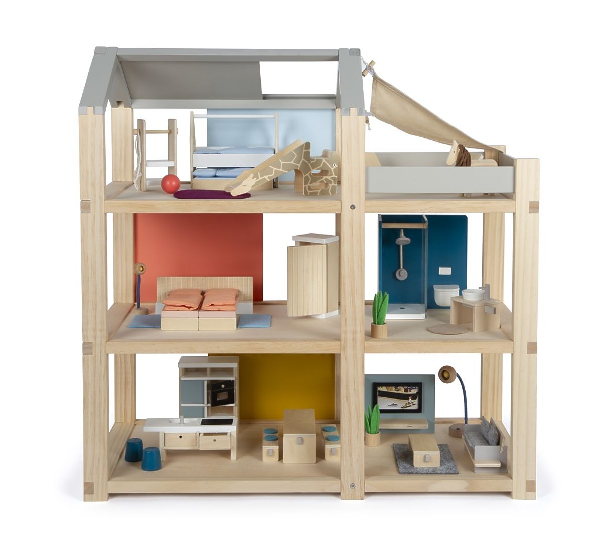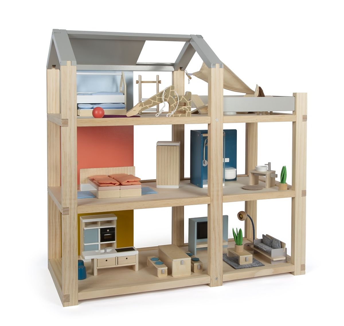 Dieses große skandinavische Puppenhaus aus Holz mit drei Etagen und einer geräumigen Dachterrasse wird nicht nur ein unterhaltsames und kreatives Spielzeug sein, sondern auch ein dekoratives Element, das in jedem Kinderzimmer auffällt. Das Puppenhaus hat drei Etagen. Es besteht aus einem gemütlichen Schlafzimmer, einem Kinderzimmer mit Giraffenrutsche, einem stilvollen Badezimmer, einer modernen Küche, einem charmanten Esszimmer, einem gemütlichen Wohnzimmer, einer geräumigen Dachterrasse und ist komplett mit detailliert gestaltetem Puppenmöbel ausgestattet. Dank der verschiebbaren Rückwände kann das Aussehen des Innenraums immer wieder verändert werden. Die Wände sind beidseitig verwendbar, auf der einen Seite haben sie eine natürliche Holzoptik, auf der anderen Seite sind sie farbig gestrichen. Das Puppenhaus ist sofort spielbereit – es wird kein weiteres Zubehör benötigt. Hauptmerkmale: für Puppen 12 cm, geräumige Zimmer und große Dachterrasse, voll ausgestattet mit Möbeln, offene Vorderwand erleichtert das Spiel, unterhaltsames und kreatives Spielzeug, geschmackvolles dekoratives Element, fördert Kreativität und verbessert das räumliche Vorstellungsvermögen, unterstützt die Entwicklung motorischer, sprachlicher und sozialer Fähigkeiten.