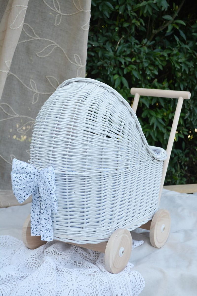 Korbwagen für Puppen aus einer einzigartigen „Country“-Kinderkollektion. Es ist ein wunderschöner und einzigartiger Puppenwagen, der den Traum jeder jungen Dame erfüllt. Er verfügt über einen Holzgriff, der tiefer liegt als bei einem Standard-Kinderwagen, und eine stabile Konstruktion, die auch kleineren Kindern ein sicheres Spielen ermöglicht. Die Holzräder verleihen dem Kinderwagen einen ästhetischen Wert und einen einzigartigen Retro-Stil.