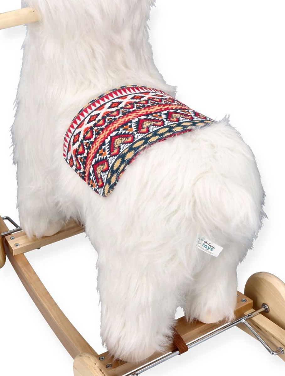Dieses neue, einzigartige Design lässt unser Alpaka unter ähnlichen Produkten hervorstechen. Das Alpaka wurde aus einem besonders weichen und leicht flauschigen Material hergestellt, um einem echten Alpaka zu ähneln. Mit einem fröhlichen Gesicht und einem bunten Sattel mit peruanischen Mustern sieht es wirklich außergewöhnlich aus. In einem Ohr befindet sich ein Knopf, der eine Melodie abspielt. Außerdem ist das Alpaka mit Rädern ausgestattet, sodass es auf zwei Arten verwendet werden kann: zum Schaukeln oder zum Fahren.