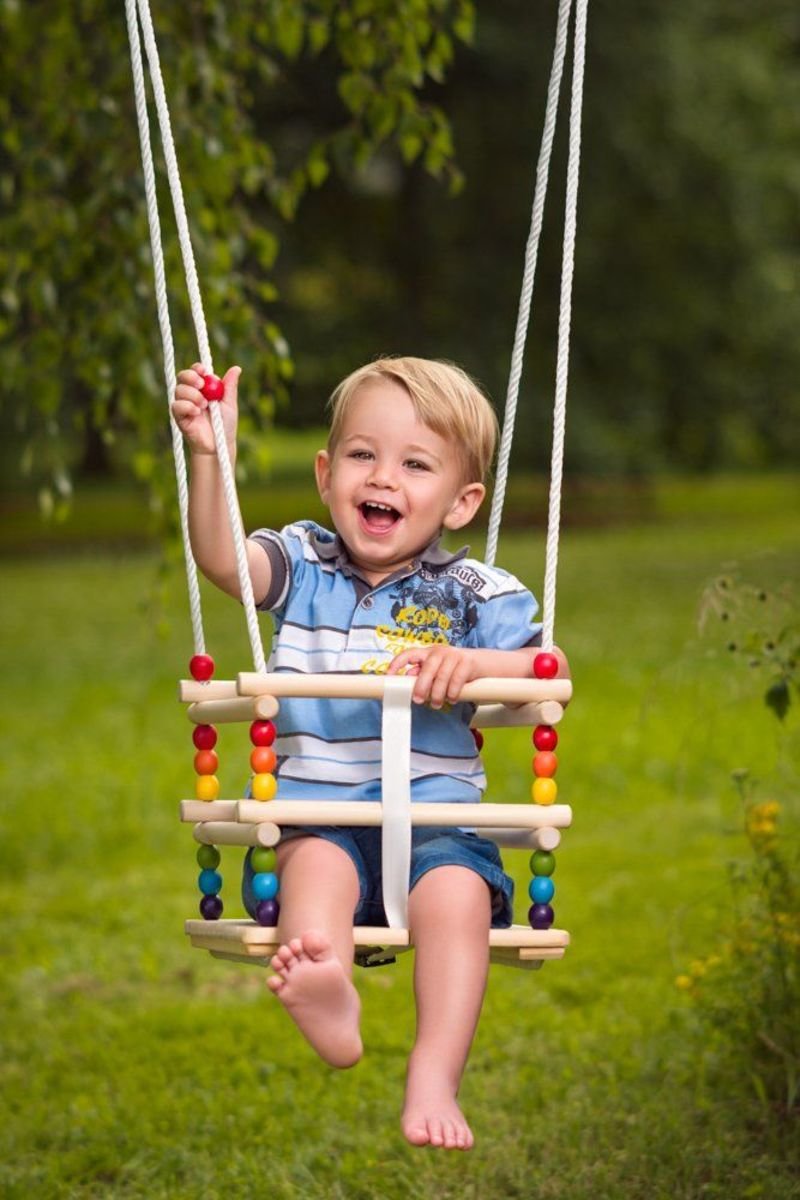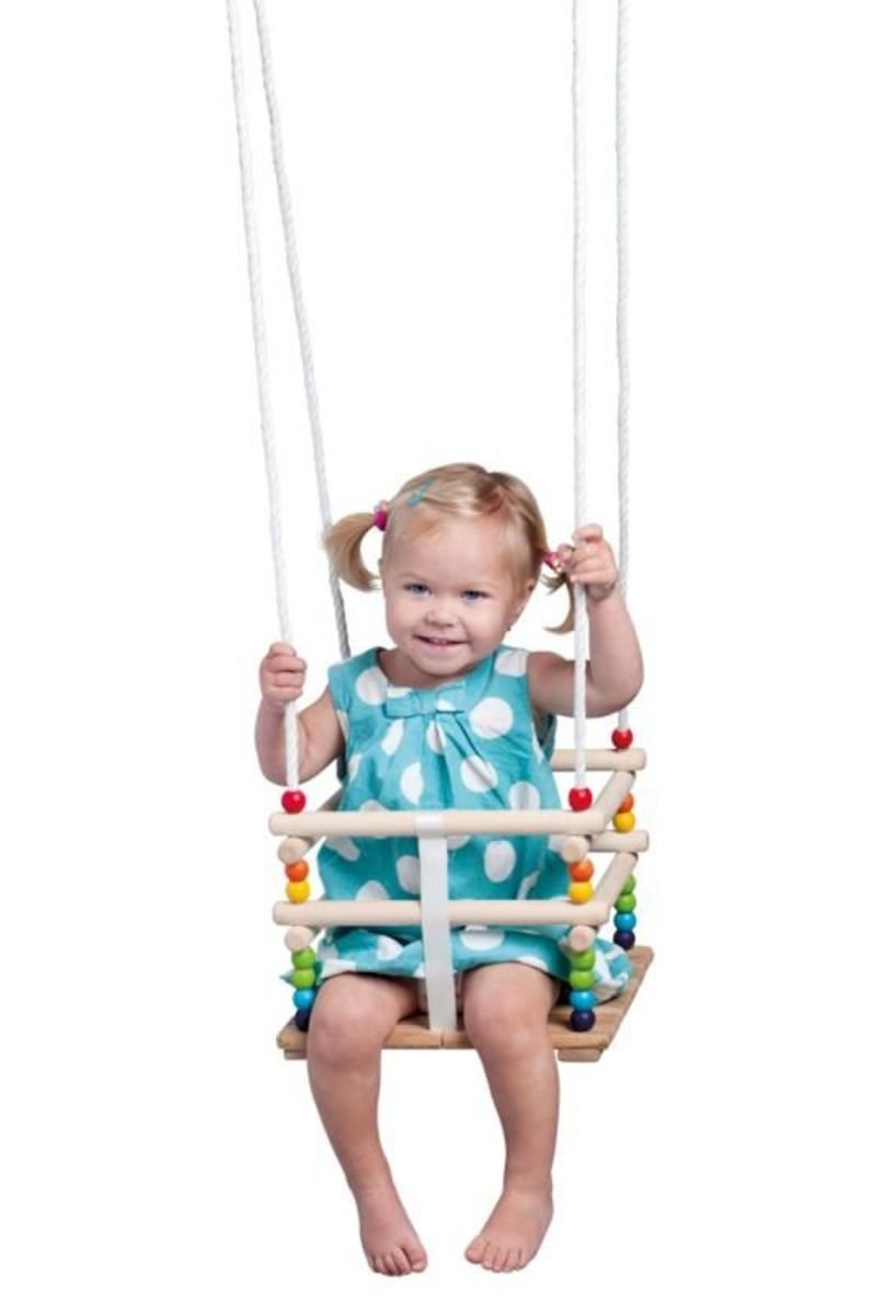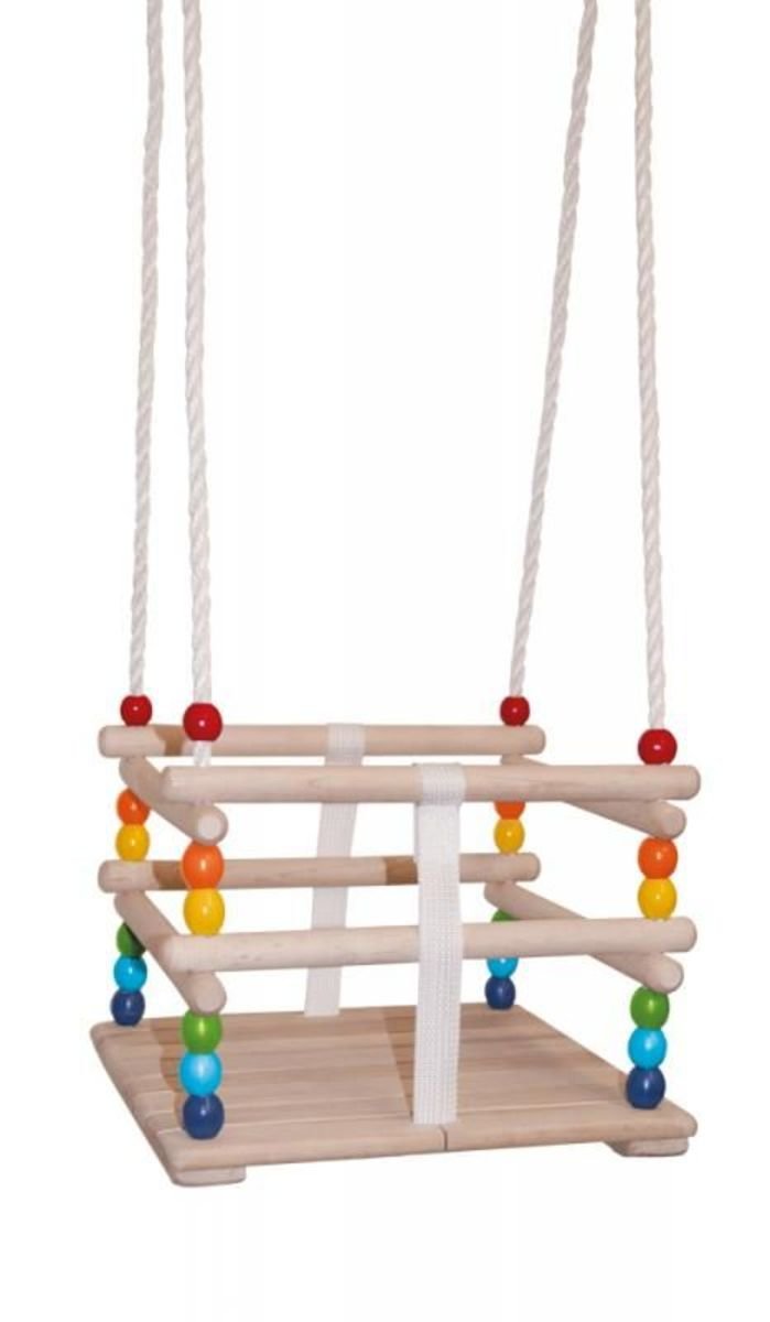 Eine Holzschaukel mit bunten Perlen sorgt für viel Spaß für das Kind zu Hause und im Garten. Die Schaukel regt das Kind auf spielerische Weise zu Bewegungen an und fördert seine motorischen Fähigkeiten.