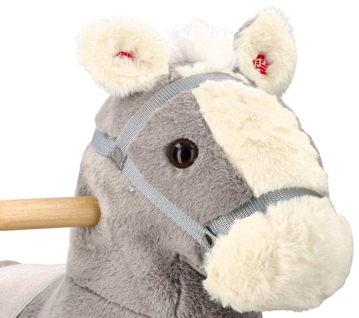 Das wunderschöne Pferd besteht aus weichem Plüschmaterial in Grau mit weißen Akzenten wie Mähne, Schnauze und Schweif. Zaumzeug und Sattel sind in Grau gehalten. Die Kufen und Griffe sind aus leichtem und angenehm anzufassendem Holz gefertigt.