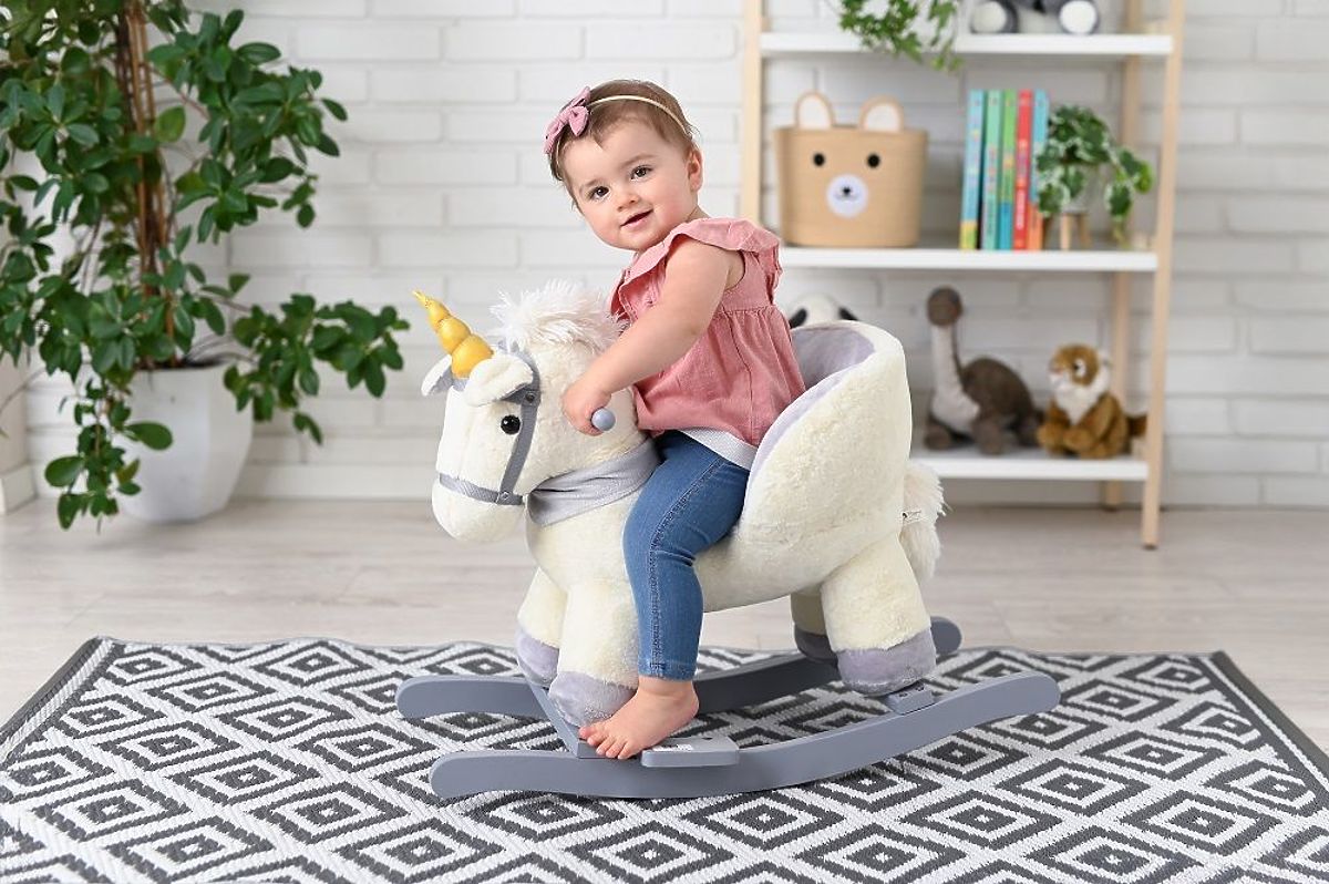 Ein magisch schaukelndes Einhorn mit goldenem Horn bringt Ihnen viel Spaß! Kinder werden die Soundeffekte genießen und Eltern werden die hochwertige Verarbeitung und das moderne Design zu schätzen wissen. Das Spielzeug ist für Kinder ab 10 Monaten gedacht, denen es dank der Rückenlehne am Sitz und am Sicherheitsgurt Sicherheit bietet.