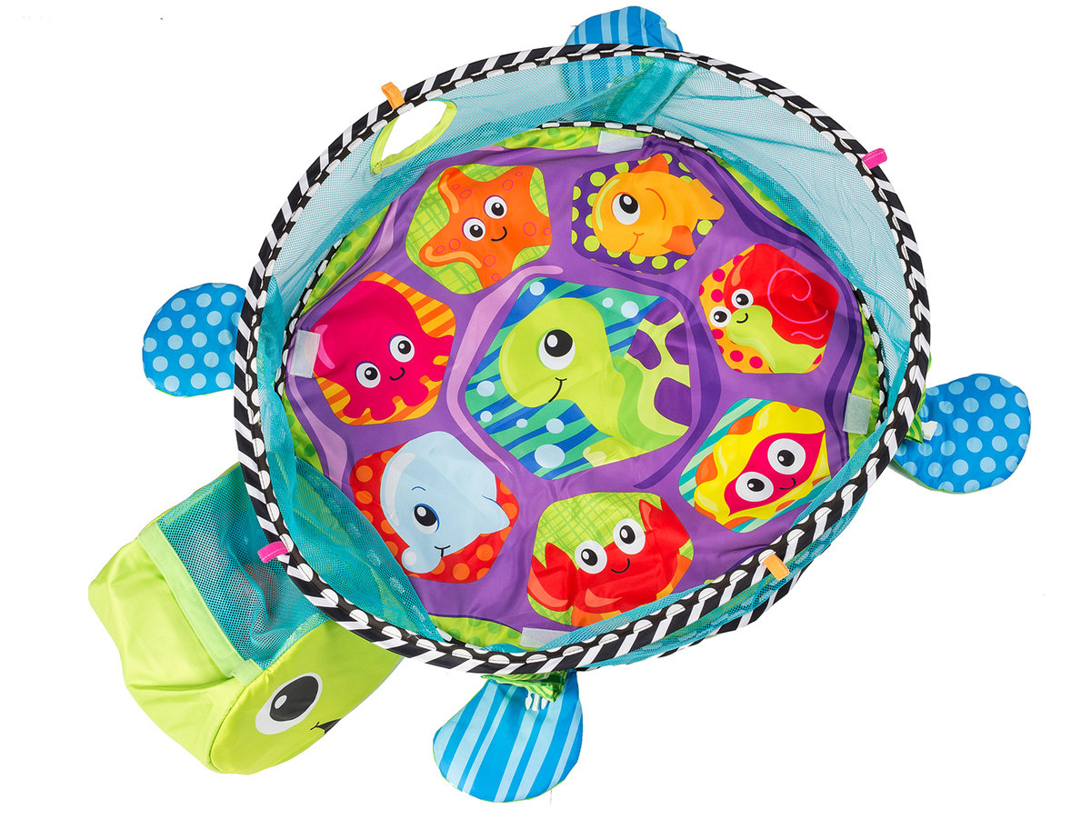 Der Kopf der Schildkröte dient als Unterschlupf für die farbigen Kugeln, die Teil des Pakets sind. An den Seiten des Pads befinden sich Riegel zum Befestigen von Stangen mit hängenden Spielzeugen. Für ältere Kinder können Sie aus der Matte einen kleinen Laufstall mit Spielzeug und Bällen basteln.