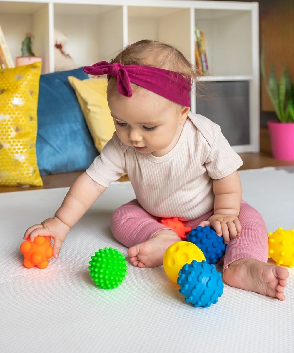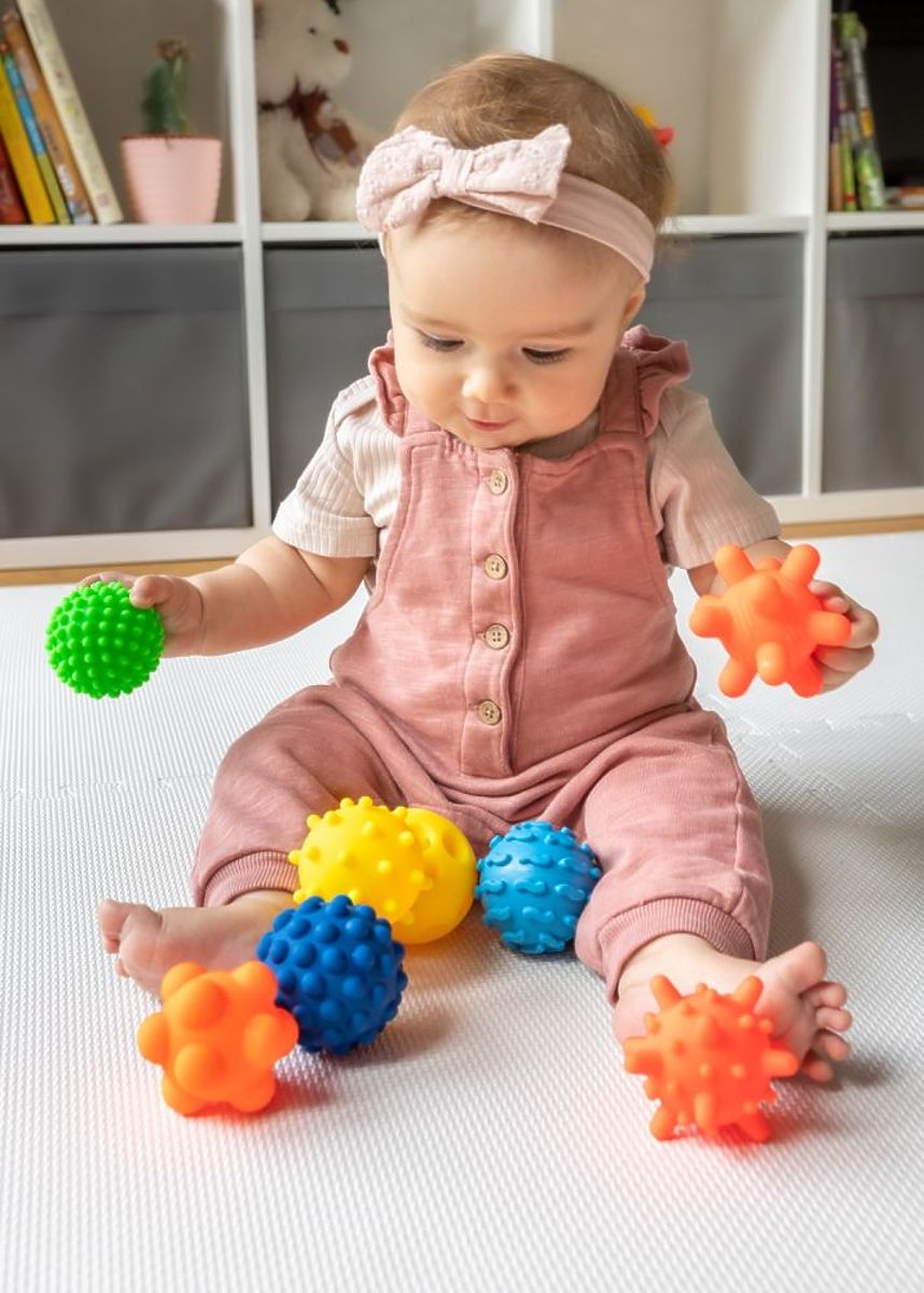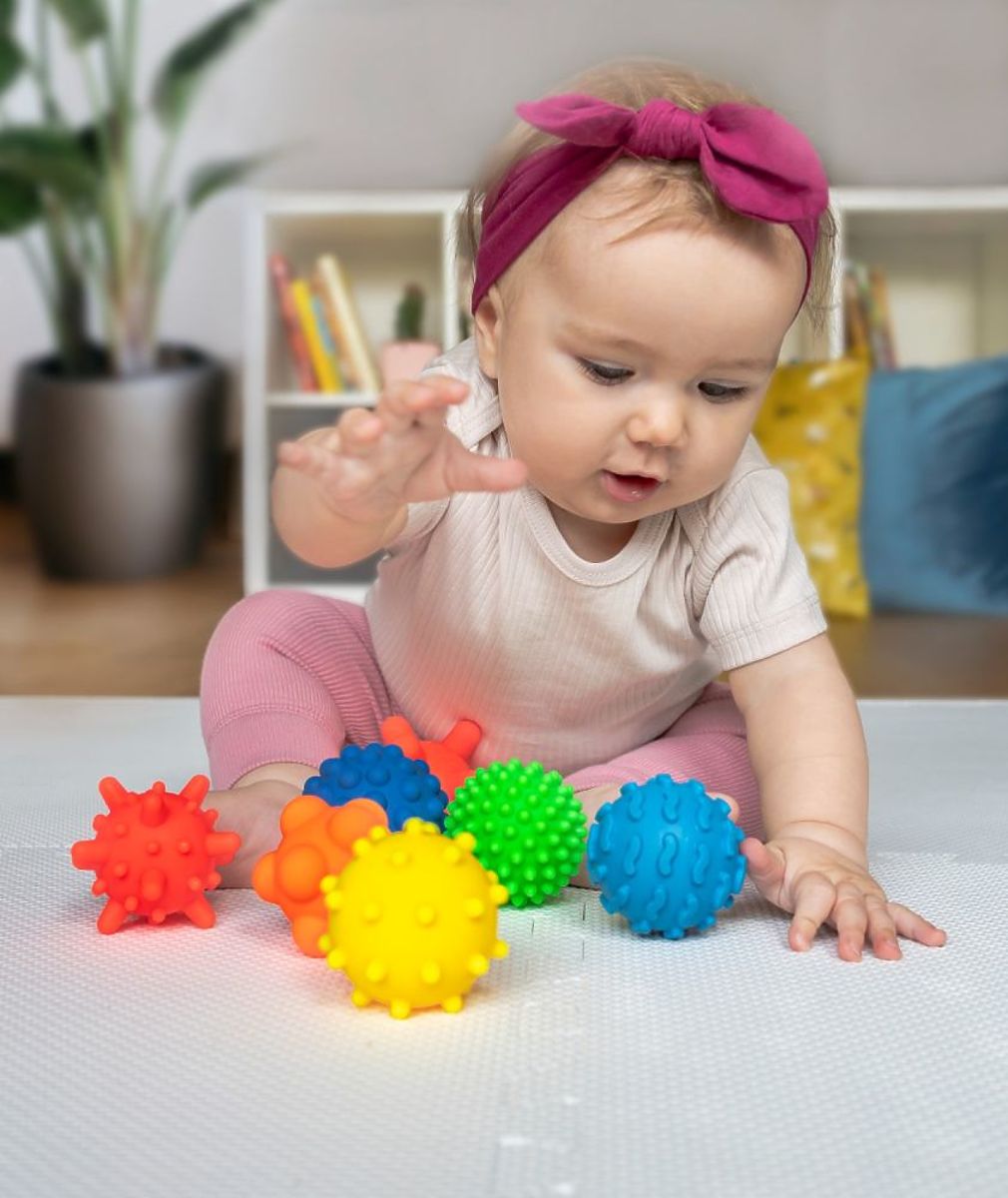 Das Set enthält 8 farbige Bälle. Jeder hat eine andere Oberfläche, ihr Gewicht variiert und vor allem die bunte und vielfältige Farbgebung zieht die Aufmerksamkeit der Kinder auf sich.