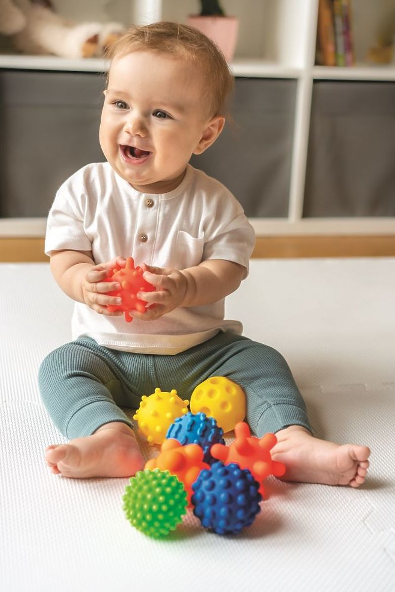 Ein Set von acht sensorischen Bällen, die für Körpermassage, Rehabilitation, gymnastische Übungen oder sogar Bäder bestimmt sind. Dank der Vielfalt der Bälle in Bezug auf Textur, Farbe und Gewicht werden die wichtigsten Sinne des Kindes aktiviert, um seine Erfahrungen zu stärken und ihm verschiedene Aktivitäten zu ermöglichen.
