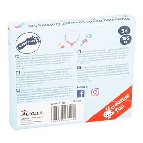 Maße: 15x13x2 cm Alter: 3+ Material: Holz, Metall, Stoff Inhalt: ca. 190 Perlen, 3 Anhänger, 3 Schnüre