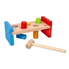 Ein klassischer Hammer mit Hammer, mit dem das Kind farbige Stifte in die Löcher im Brett hämmert. Der Holzhammer wird nicht nur von Jungen geschätzt, die so ihren Vater bei der Arbeit mit dem Hammer nachahmen können.