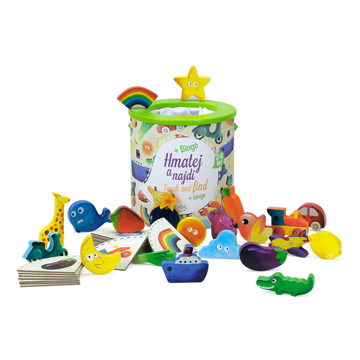 Der unübertroffene Bestseller Vilac versucht, den oft vernachlässigten Tastsinn von Kindern auf originelle Weise zu fördern. Das Spiel besteht hauptsächlich aus Holzfiguren, die in einem Eimer versteckt sind, in dem sich ein weicher Stoffbeutel befindet. Nachdem sie ihre Hand in die Röhre gesteckt haben, müssen die jüngeren Kinder mit eigenen Worten beschreiben, welchen Gegenstand sie in der Hand halten, basierend auf dem Gefühl, allein zu sein. Eltern können ihren Kindern die Vorgehensweise anhand eines anschaulichen Beispiels demonstrieren. Ältere Kinder können ein Spiel in Form von Lotto oder Bingo spielen, für diese Spiele sind Bildkarten mit einzelnen Gegenständen im Set erhältlich. Hauptmerkmale: 21 Spielfiguren und 20 Bildkarten für 2-5 Spieler verschiedene Spielvarianten praktische Verpackung Spielanleitung: Tasten und Finden: Der erste Spieler nimmt eine Karte vom Stapel. Dann müssen sie in die Tasche greifen und das Holzstück ertasten, das zum Bild auf der Karte passt. Wählt er die richtige Figur, behält er die Karte und der nächste Spieler ist an der Reihe, der erneut eine Karte vom Stapel zieht. Wählt der erste Spieler jedoch das falsche Plättchen, muss er seine Karte an den nächsten Spieler weitergeben, der versuchen muss, das richtige Plättchen zu finden. Nach jeder Runde werden die Spielsteine zurück in den Beutel gelegt. Wenn keine Karten mehr im Stapel sind, wird der Gewinner ermittelt. Der Spieler mit den meisten Karten gewinnt. Aufmerksamkeit! Zieht einer der Spieler versehentlich eine bombenförmige Figur, muss er alle seine Karten auf den Stapel zurücklegen! Sie können die Regeln nach Belieben anpassen, um Kindern das Fühlen und Finden von Gegenständen zu erleichtern: 1 – Beginnen Sie mit einer kleinen Anzahl von Holzstücken. 2 – Lassen Sie die Kinder in die Tasche schauen. 3 – Machen Sie das Spiel dann wieder etwas schwieriger, lassen Sie sie nicht in die Tasche schauen. 4 – Fügen Sie dem Beutel weitere Stücke hinzu. 5 – Wenn sich die Kinder schließlich an das Spiel gewöhnt haben, spielen Sie nach den traditionellen Regeln. BINGO-Variante: Lege 4 Karten im Quadrat aus und gestalte für jeden Spieler ein oder mehrere Spielfelder. Einer der Spieler oder ein Elternteil nimmt ein Stück aus dem Beutel und ruft es aus. Der Spieler, der eine Karte hat, die dieser beschworenen Figur entspricht, nimmt sie und legt sie auf seine Karte. Der erste Spieler, der sein Spielfeld auffüllt, gewinnt! Dokumentation: Anleitung zum Spiel Touch and Find (CZ) Anleitung zum Spiel Touch and Find (SK)