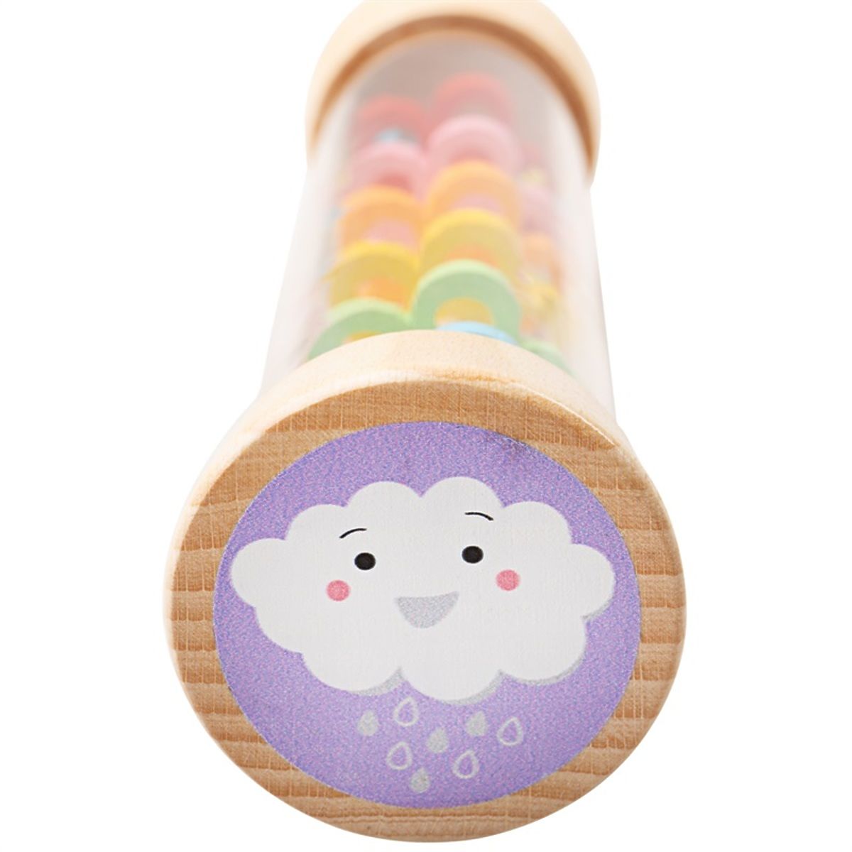 Ein süßes Holzspielzeug, das Regengeräusche macht. Beim Drehen des zylindrischen Spielzeugs beginnen sich die farbigen Perlen im Inneren zu bewegen, wodurch ein interessanter visueller und akustischer Effekt entsteht. Auf beiden Seiten finden Sie Holzstopfen mit einer schönen Illustration einer Sonne und einer Wolke. Hergestellt aus hochwertigen Materialien aus verantwortungsvollen Quellen. Erfüllt europäische Sicherheitsstandards. Hauptmerkmale: auffälliges Audio- und visuelles effektresistentes Design