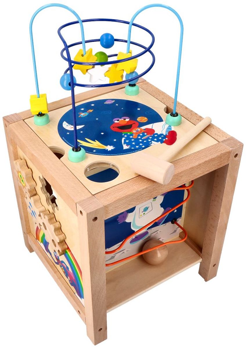 5. Die letzte Seite, die sich oben auf dem Würfel befindet, ist eine klassische motorische Schleife, die aus 2 Stäben besteht. Einer der Stäbe ist in Form einer Parabel gebogen, der andere in Form einer Spirale. Auf den Stäben befinden sich bunte Holzkugeln in Form von Kugeln und Sternen. Neben der Schleife befindet sich ein Loch, durch das die Kugel mit einem Hammer geschlagen werden muss, damit sie die Rutsche hinunterrollt, die eine Attraktion der Seitenwand ist. Das Gesamtbild der Oberseite wird durch ein wunderschönes Bild mit Weltraummotiv und der sympathischen Figur von Elmo, der seinen Lieblings-Teddybären umarmt, ergänzt.
