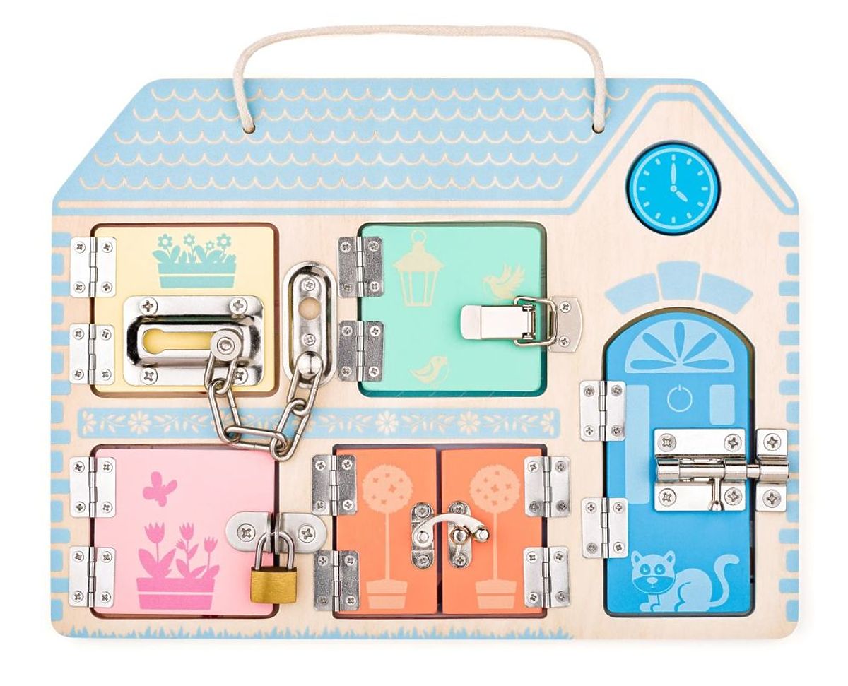 Kleine Hände, großes Aufschließen! Fünf verschiedene Schlösser und Geheimnisse hinter jeder Tür – all das fördert Konzentration, Geduld und spielerisches Lernen. Diese Bildungstafel verbindet motorische Fähigkeiten mit logischem Denken.