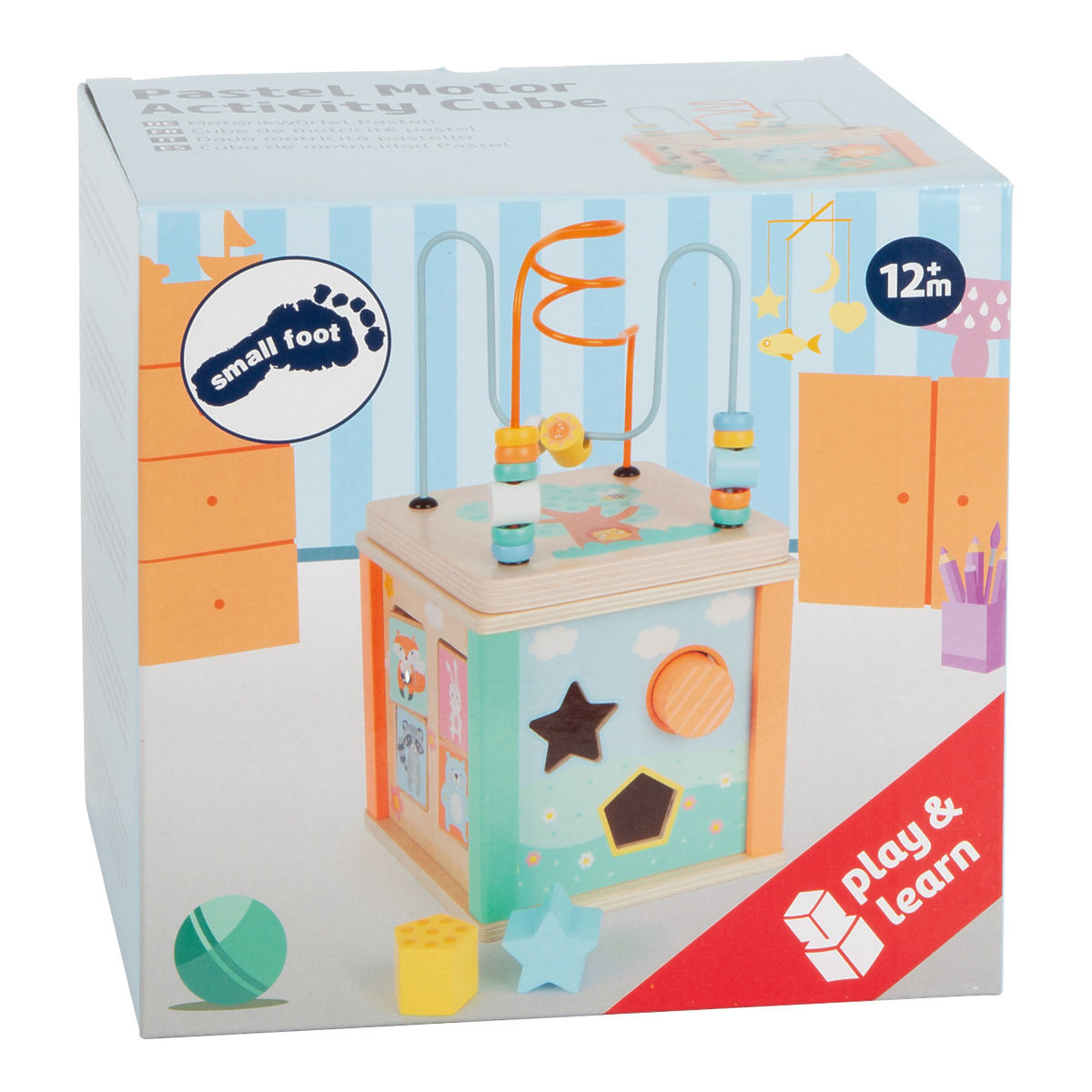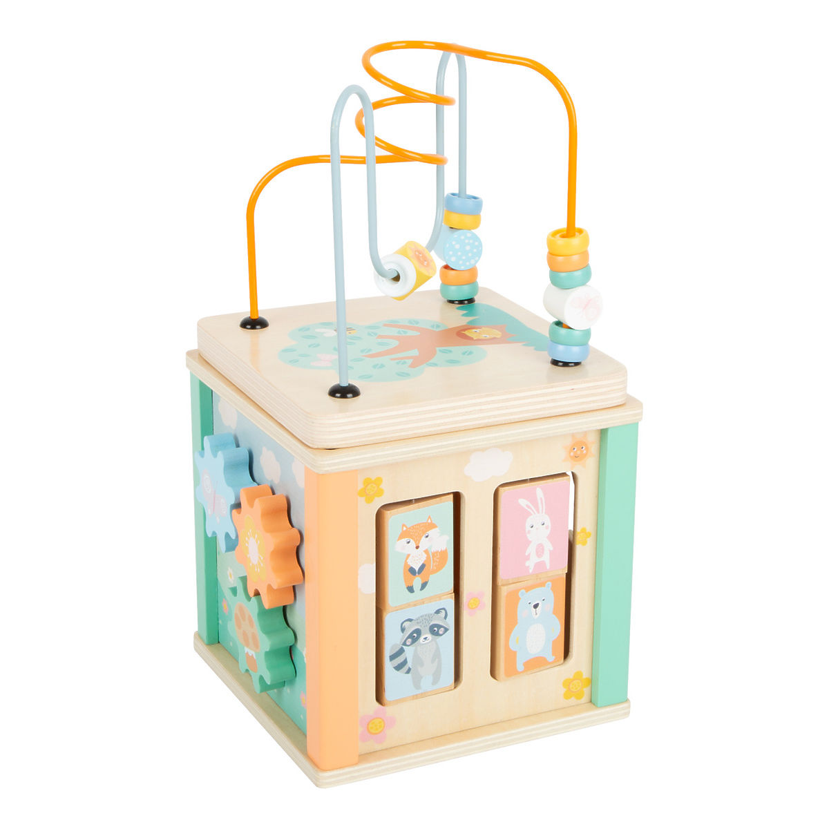 Falten, schieben, drehen, drehen! Sie können von allen fünf Seiten spielen! Ein hölzerner Motorikwürfel mit Aktivitäten bietet auch den Kleinsten Spaß.
