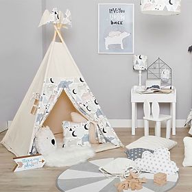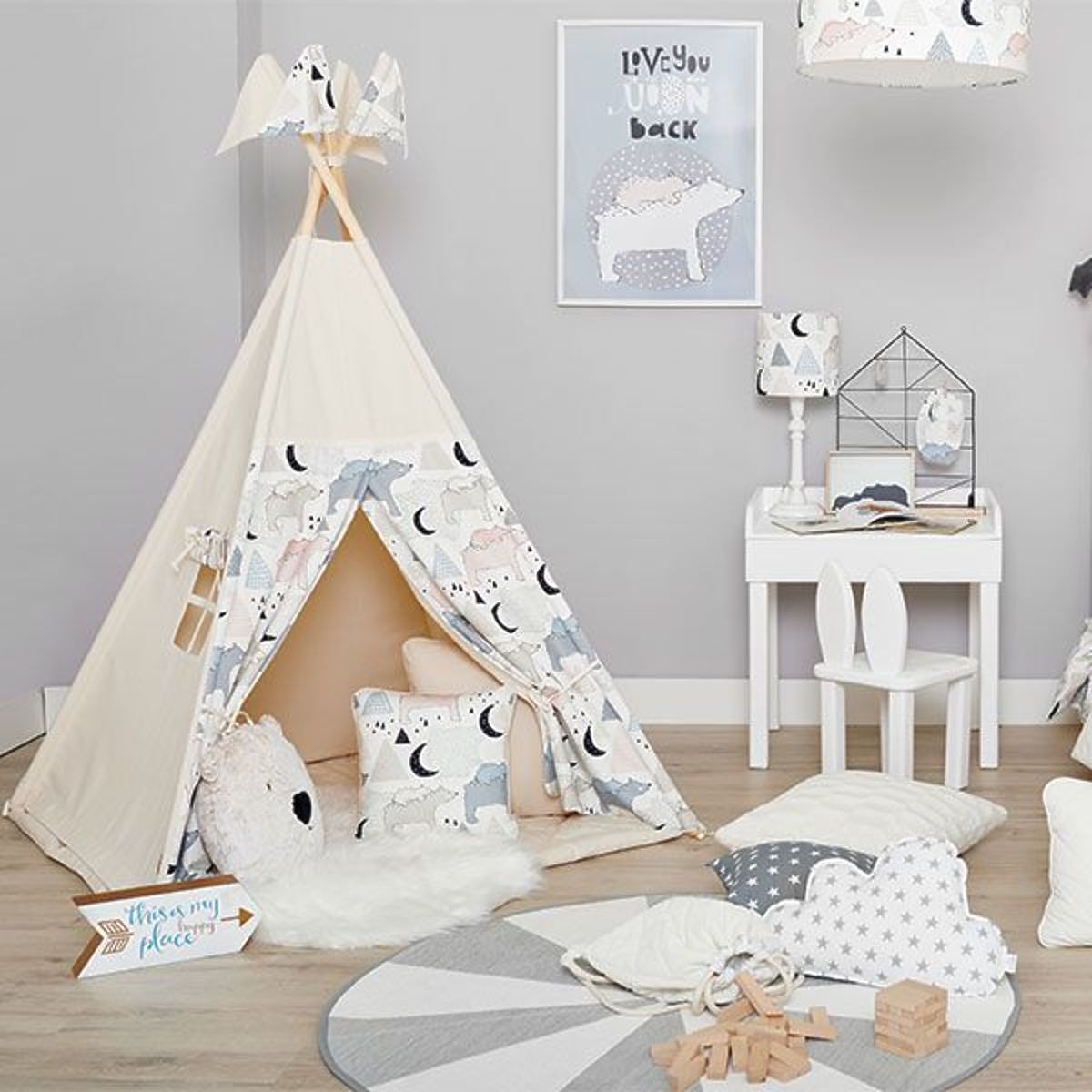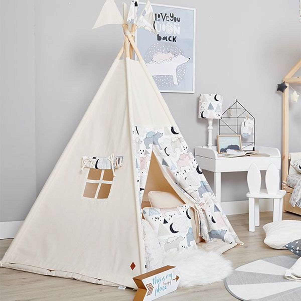 Ein modernes Tipi-Zelt mit Bärenthema ist zu jeder Jahreszeit ein tolles Versteck für Ihr Kind. Es kann im Innenbereich, auf der Terrasse, auf dem Balkon oder sogar im Garten verwendet werden. Das Tipi passt nicht nur zu einem Kind, sondern auch zu einem Elternteil, das gerne eine Gutenachtgeschichte liest.