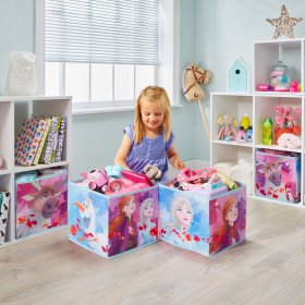 Wunderschöner bunter Spielzeug Organizer mit Frozen 2 - Motiv. Mit Anna und Elsa Print auf den Seiten. Der Veranstalter ist für Kinder leicht zugänglich, sodass sie ihre Sachen selbst aufbewahren können. Gleichzeitig ist es eine großartige Alternative zu einer stumpfen Kommode oder einem Spielzeugständer.
