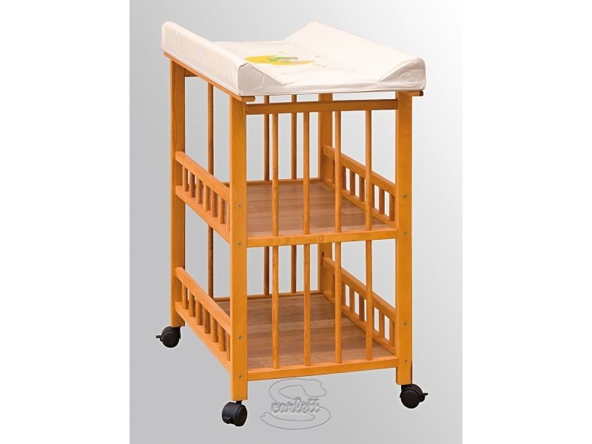 Der Wickeltisch wurde aus Kiefernholz hergestellt, Dies ist die Ausführung Teak. Unter der eigentlichen Wickelfläche befinden sich zwei Ablageflächen.