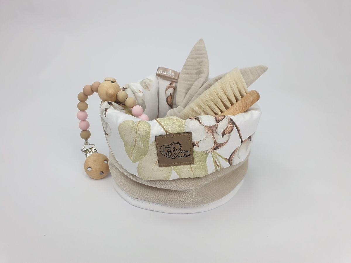Doppelseitiger Stoffkorb für Windeln, Kosmetik und andere Babyartikel. Ein Stoffkorb mit dem Motiv von Blumen und Baumwollblättern wird auch eine schöne Dekoration für ein Kinderzimmer sein.