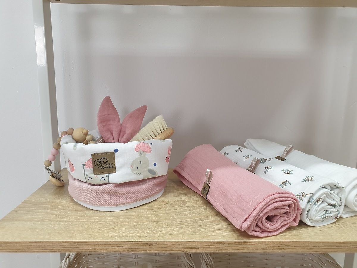 Doppelseitiger Stoffkorb für Windeln, Kosmetik und andere Babyartikel. Ein Stoffkorb mit niedlichem Hasenmotiv ist auch eine schöne Dekoration für ein Kinderzimmer.