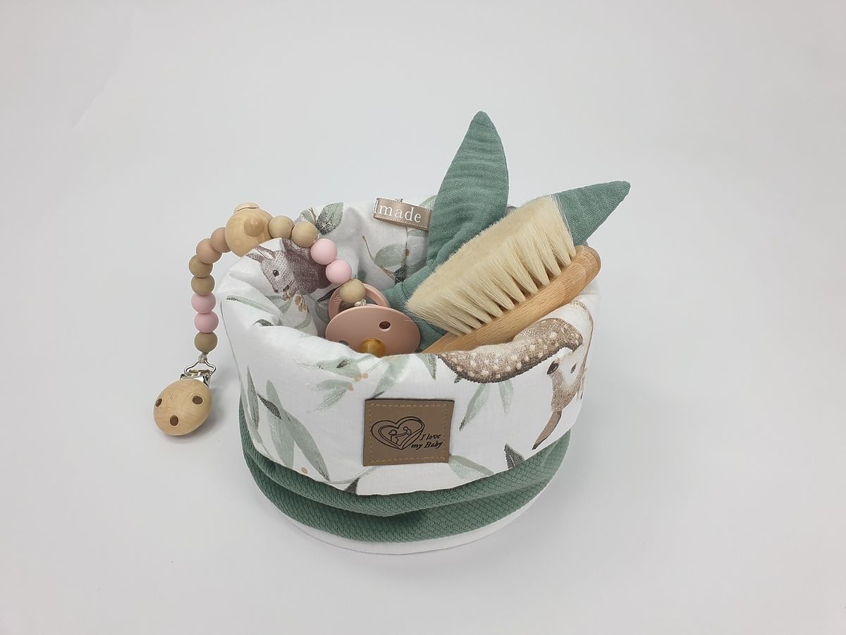 Doppelseitiger Stoffkorb für Windeln, Kosmetik und andere Babyartikel. Ein Stoffkorb mit dem Motiv von Waldtieren wird auch eine schöne Dekoration für ein Kinderzimmer sein.