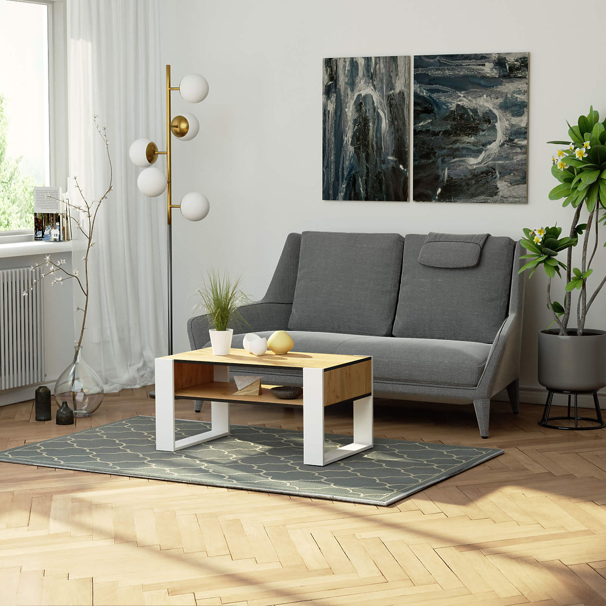 Der Couchtisch Domi in Eiche Craft mit weißen Beinen verbindet ein attraktives und ästhetisches Erscheinungsbild mit Funktionalität und Vielseitigkeit. Dank der warmen weißen Farbe passt der Tisch perfekt in moderne und traditionelle Innenräume und vergrößert und erhellt den Raum optisch. Die kleinen Abmessungen des Möbels bedeuten, dass der Tisch auch in einem kleinen Raum in einer Wohnung seinen Zweck hervorragend erfüllt. Der Tisch ist ein vielseitig einsetzbares Möbelstück. Er kann nicht nur zum Kaffeetrinken, Teetrinken oder für kalte Getränke, zum Empfangen von Gästen oder zur täglichen Entspannung verwendet werden. Der Tisch mit funktionaler Platte eignet sich auch zum Arbeiten mit einem Laptop, während das breite Regal unten die Aufbewahrung von Computerzubehör und Arbeitsmaterialien ermöglicht. Der Couchtisch Domi in Eiche Craft mit weißen Beinen ist aus abrieb- und wasserfestem laminiertem Holz gefertigt, wodurch die Tischplatte auch nass gereinigt werden kann. Die Kanten des Tisches sind mit widerstandsfähigen ABS-Kanten versehen, was die Widerstandsfähigkeit des Möbels gegen Beschädigungen weiter erhöht.